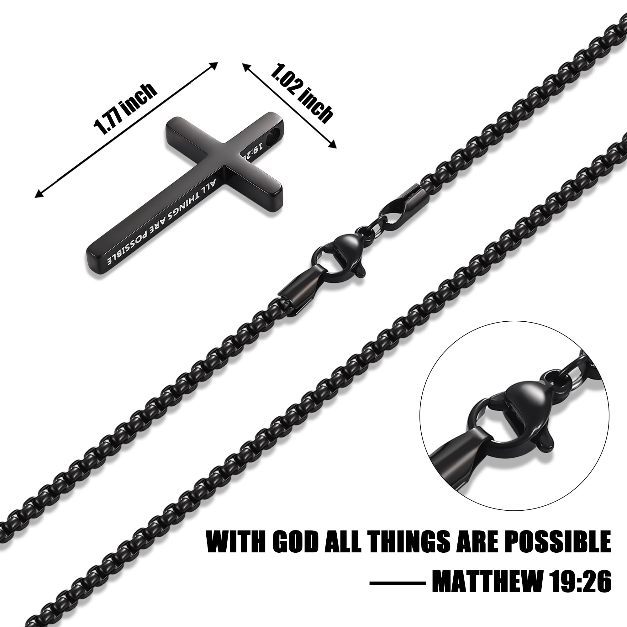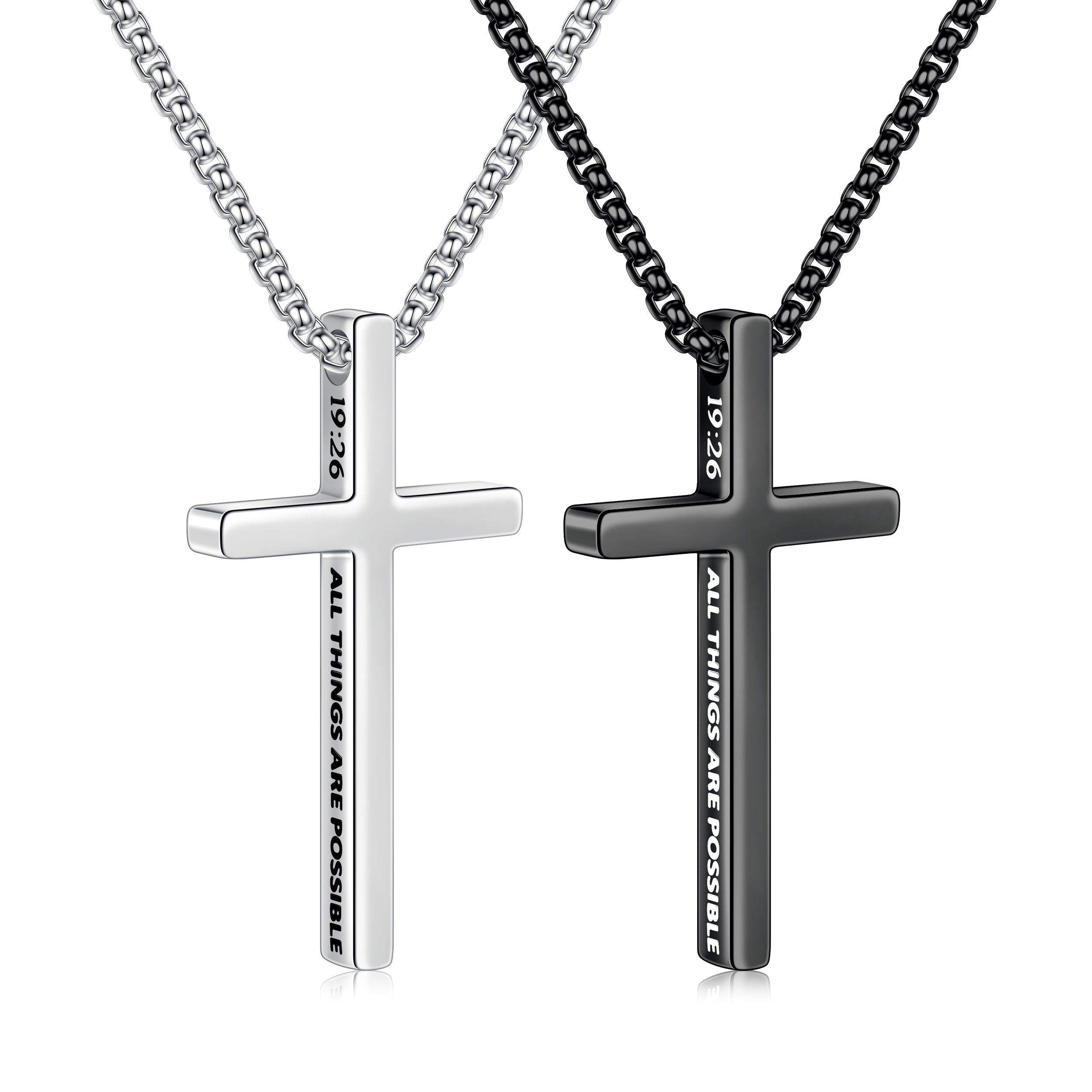 Designed for fathers, sons and brothers, this black silver cross necklace for men boys is made of medical-grade stainless steel and polished to a low-profile, luxurious finish in black and silver. The black and silver chain body is paired with a three-dimensional engraved pendant, a standard 20-inch chain length that fits perfectly around the male neckline, and a personalized motivational phrase engraved on the side of the pendant.