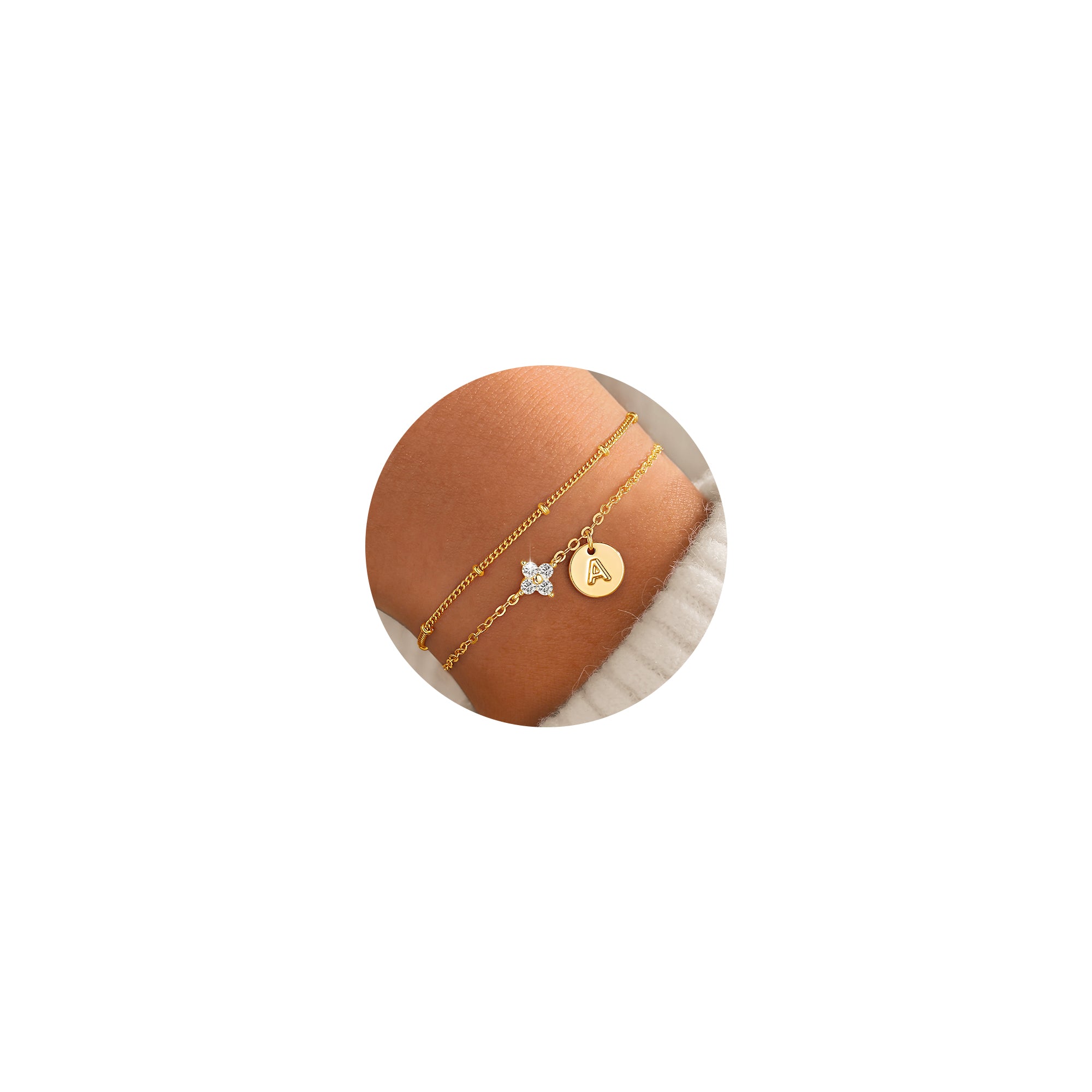 This gold layered bracelets for women perfectly combines a lucky symbol with a personalized letter. It cleverly pairs a mysterious zircon four-leaf clover with a custom letter, creating a treasured wrist piece that carries a double blessing. This innovative composite material construction features a chain made of high-grade hypoallergenic copper with thick 18K gold plating, and a disc pendant crafted from premium stainless steel. This ensures comfortable wear and creates a rich visual dimension through contrasting materials.