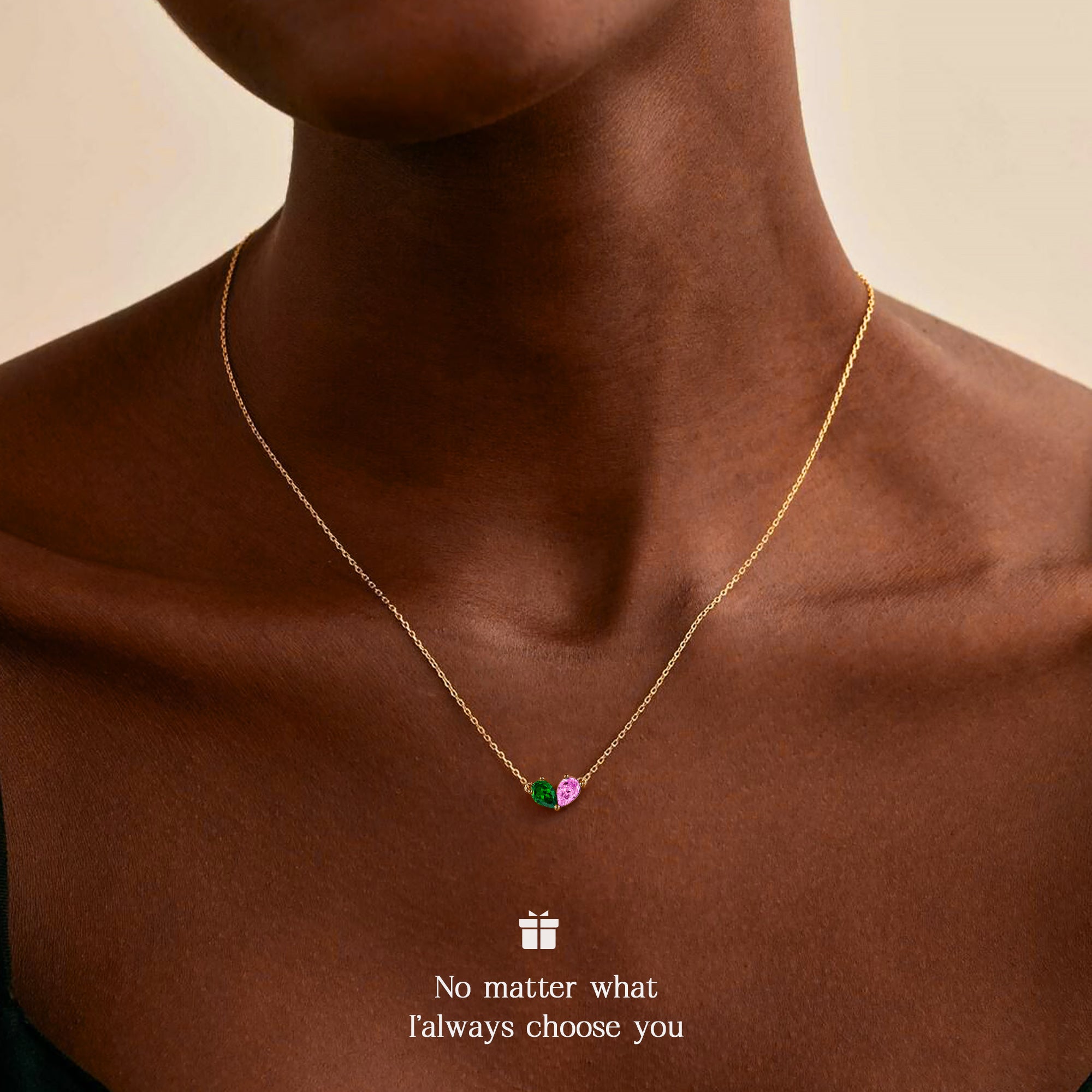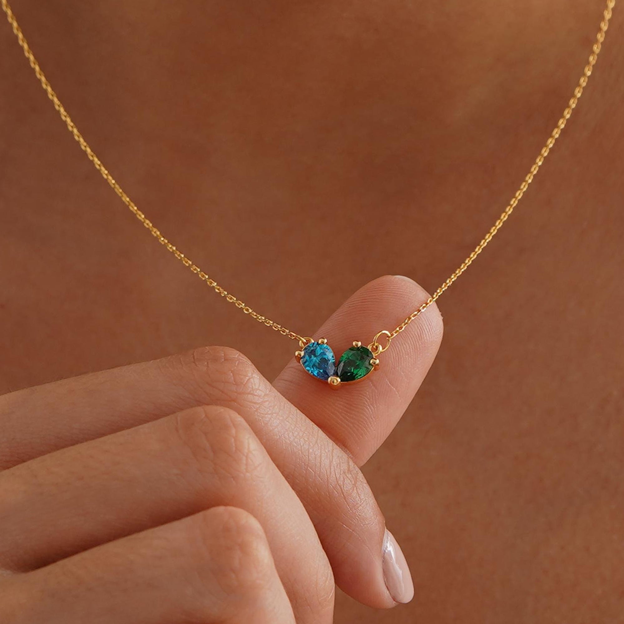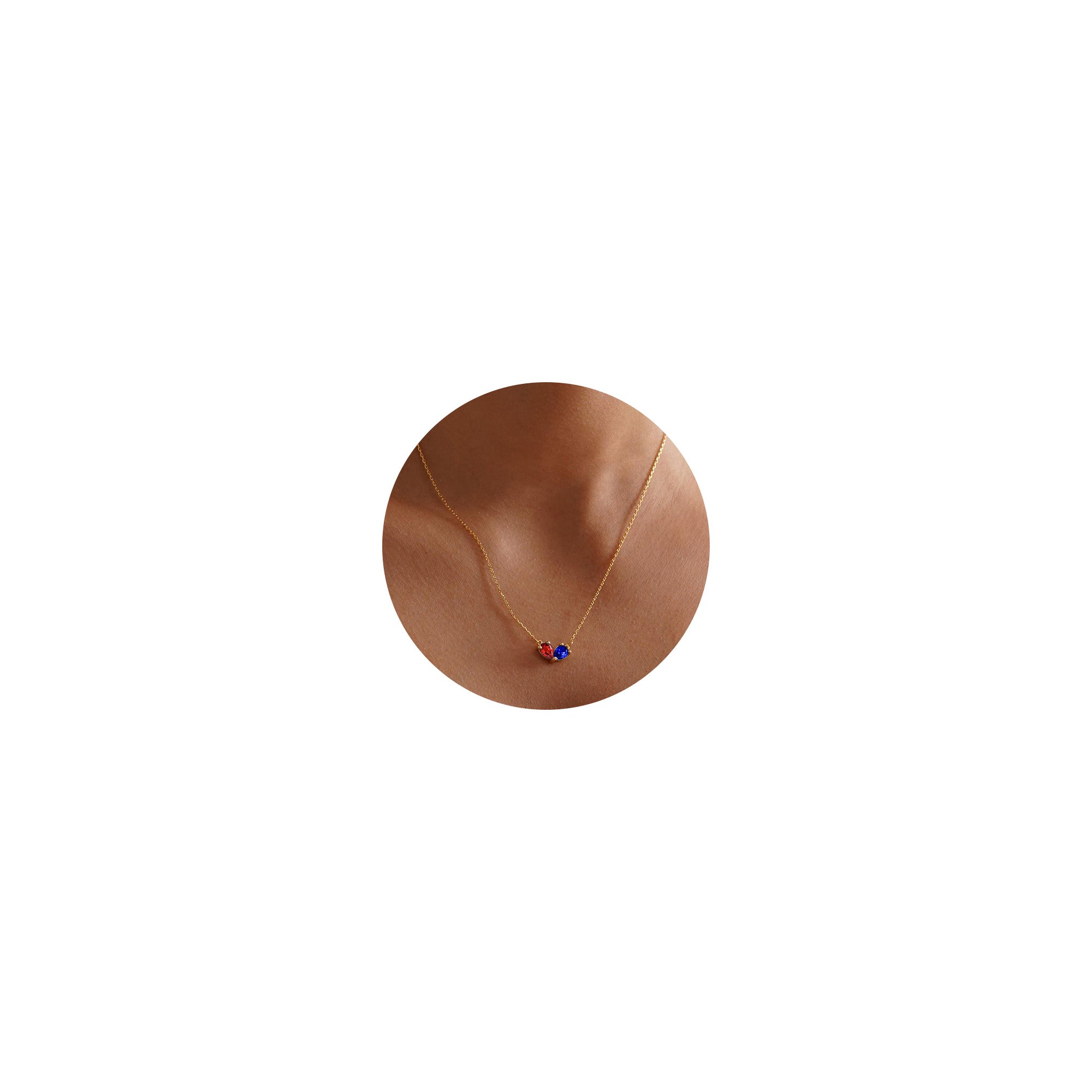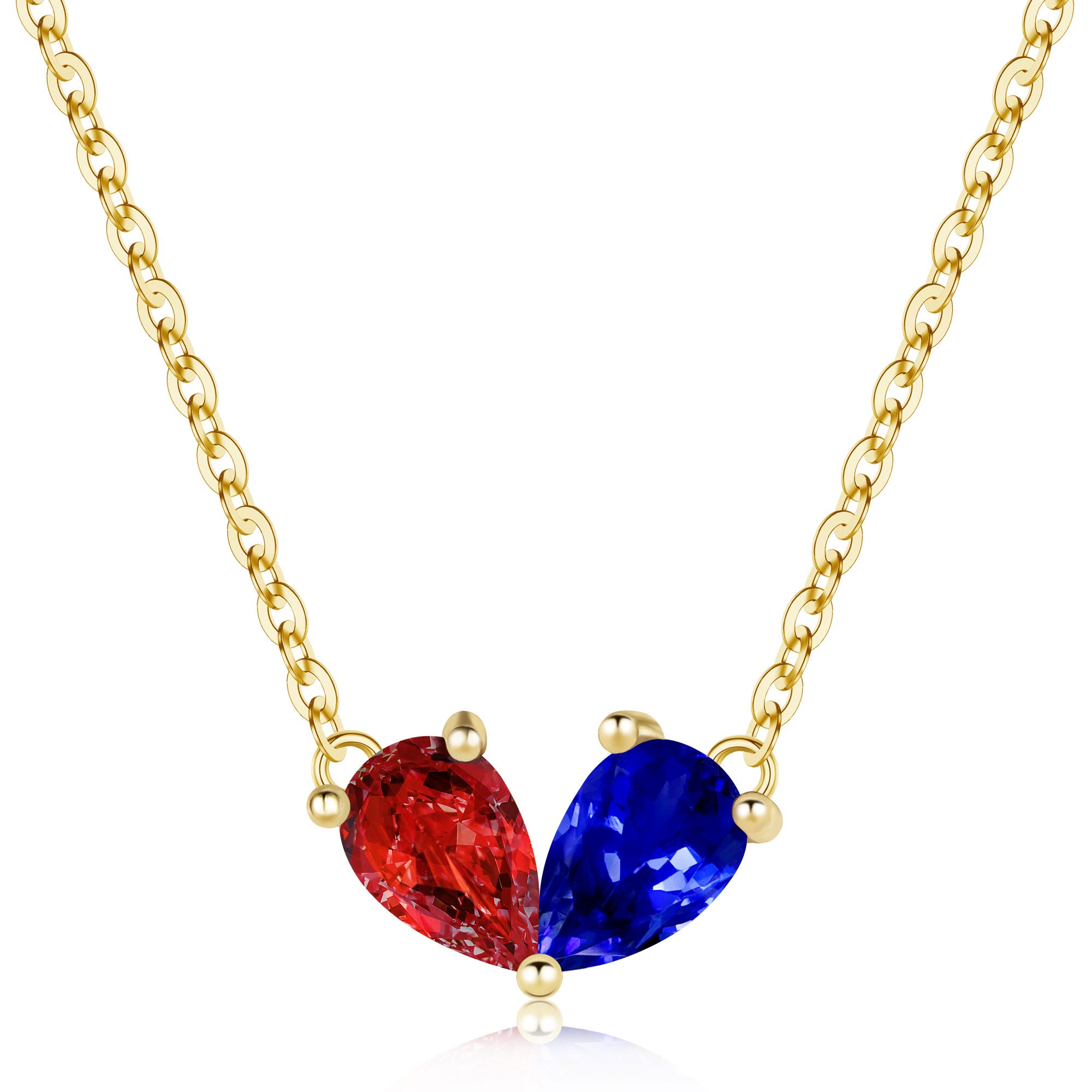 This romantic birthstone necklace for women perfectly blends a pear shape with twin birthstones. Two birthstones of different colors are set within an elegant heart, creating a treasured piece of jewelry that symbolizes double protection and a promise of love. Made from high-grade hypoallergenic copper and plated with a thick layer of 18K gold, this necklace for women not only safe for those with sensitive skin but also imparts a luxurious, dazzling golden luster that complements the two-toned birthstones for a captivating brilliance.