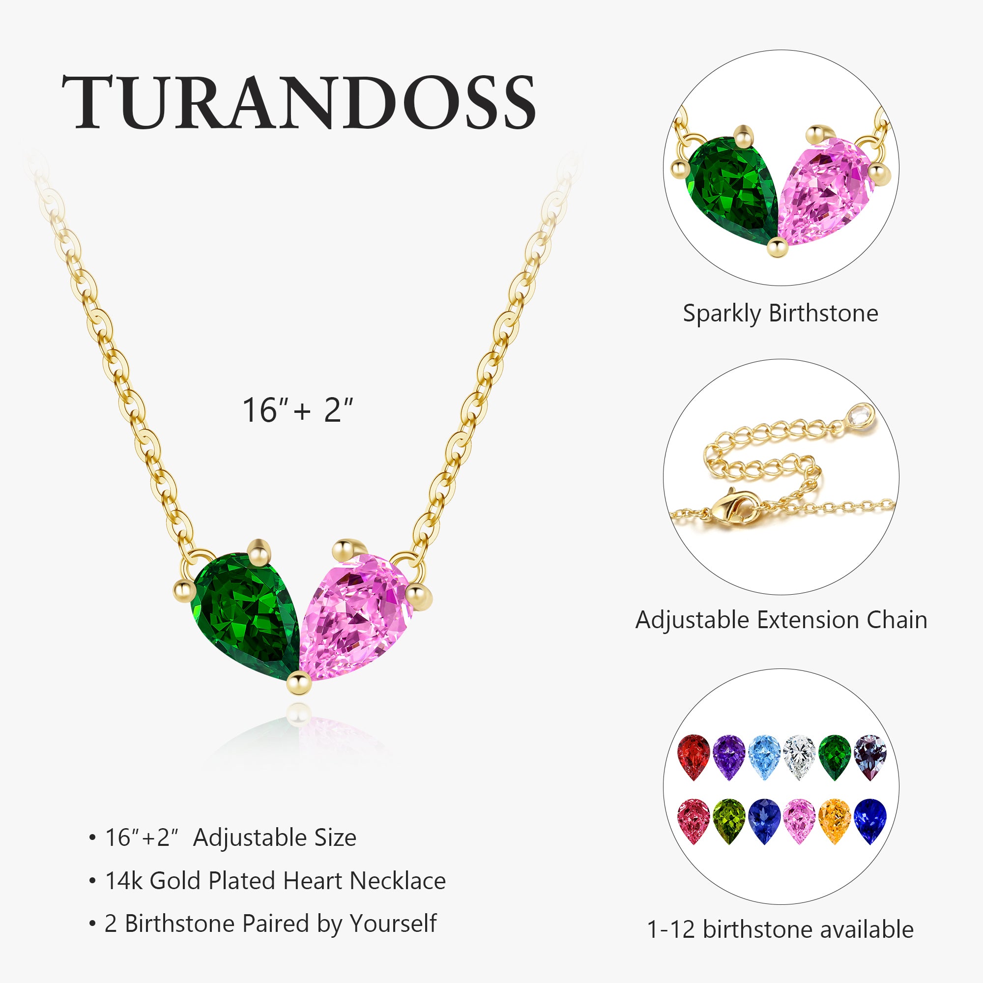 This symbolic jewelry women necklace is available in 12 exquisite styles, each featuring two meticulously matched birthstones: one corresponding to the color of the month, and the other, fixed to December's Tanzanite blue (symbolizing eternity and sincerity). The pear-shaped pendant features an innovative twin-stone design, meticulously crafted to perfectly blend the two gemstones, symbolizing the encounter and union of "you and me." The thoughtful design features a standard 16-inch length with a 2.5-inch extender chain, which can be freely adjusted with a high-quality lobster clasp. Perfect for any occasion, this necklace women can be worn as an everyday accessory or as a statement piece for special occasions.