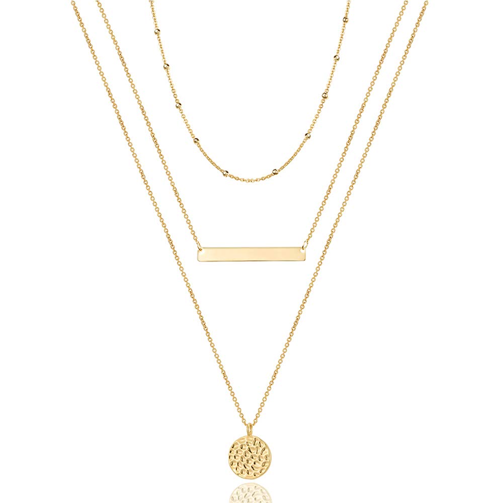 A stylish layered choker with chain links, bars, and hammered discs for added dimension.