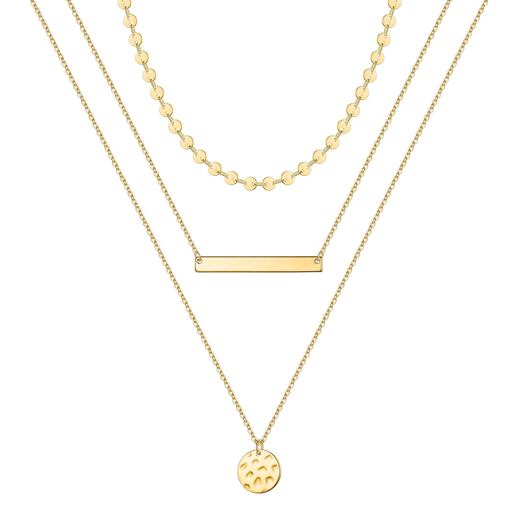 Versatile coin, bar, and hammered disc layered necklace, ideal for casual or formal wear.