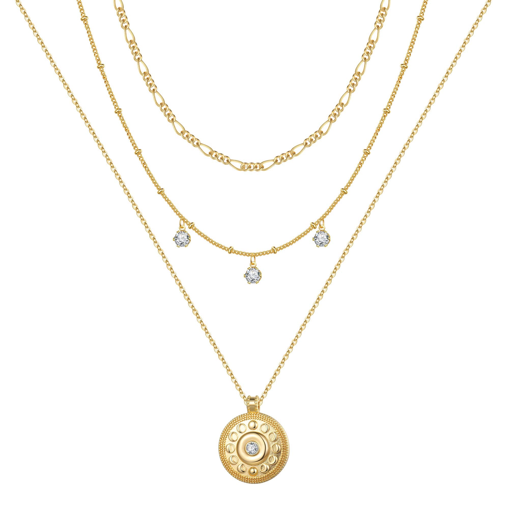 Figaro chain, CZ, and medallion pendants combine for a classic layered look.