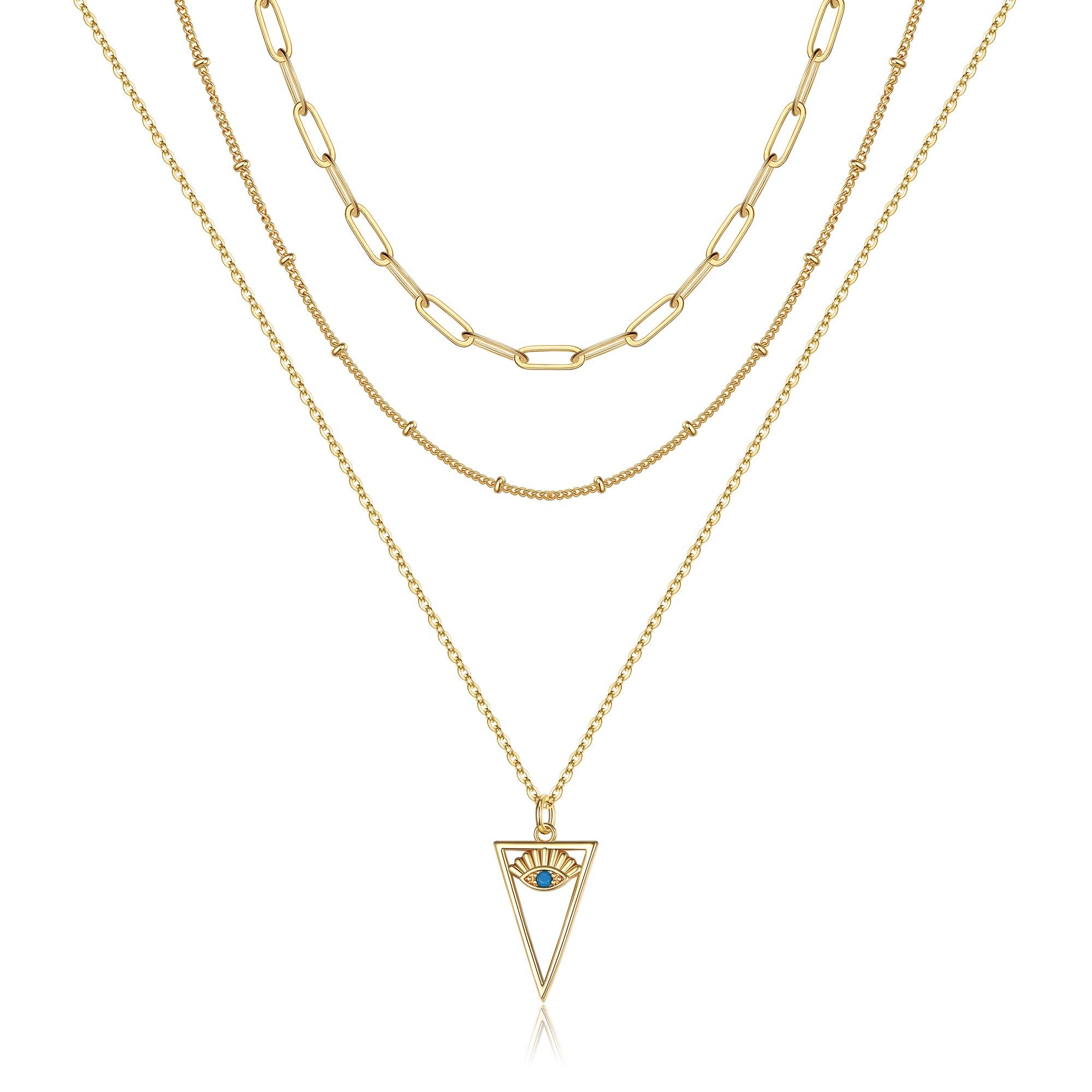 A stylish layered choker featuring link chains, beads, and an evil eye charm for protection and style.