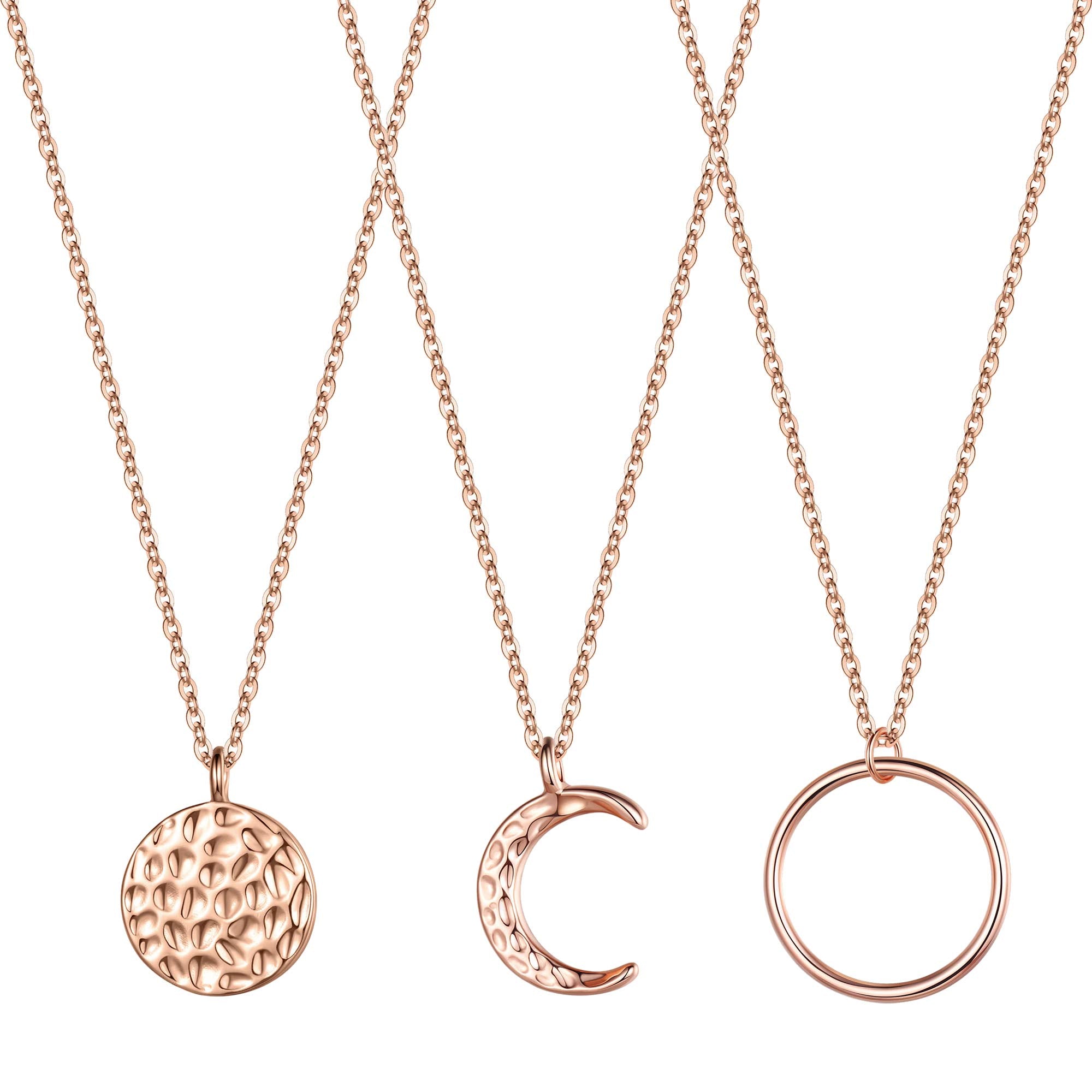 Cosmic-inspired rose gold layered necklace featuring new moon, full moon, and crescent designs.