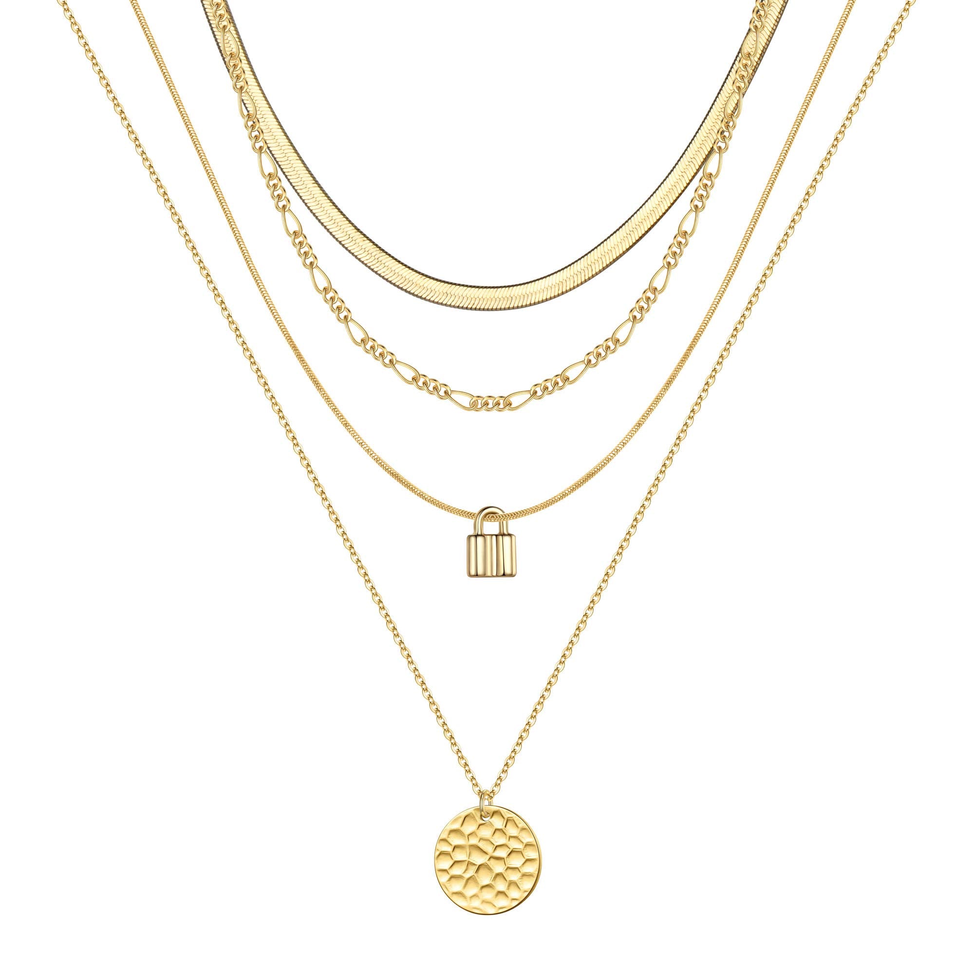 Bold snake chain, lock, and hammered disc layered necklace for a trendy statement piece.
