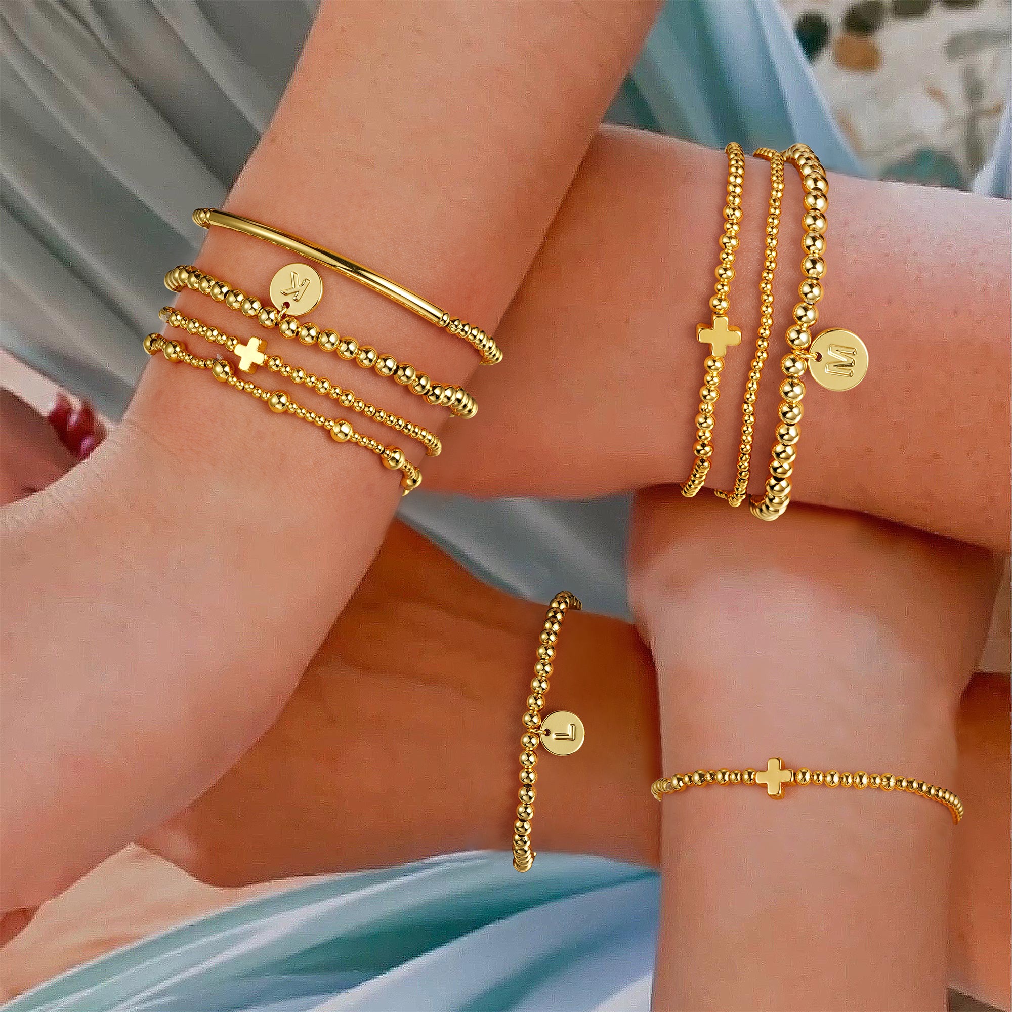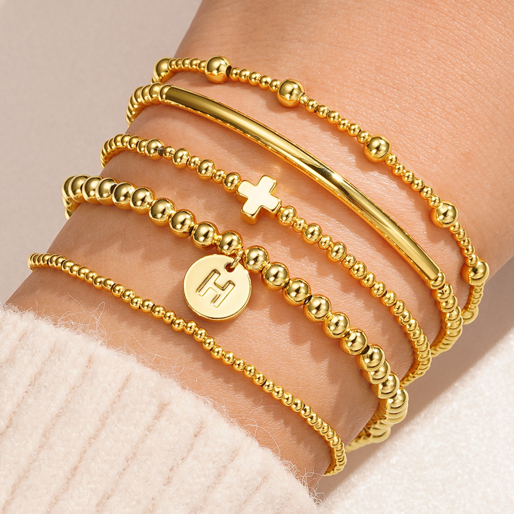 This exquisite gold women bracelet stackable set consists of five meticulously designed stainless steel beaded chains. Each bracelet features 316L medical-grade stainless steel beads, each precision-machined and hand-polished three times for a perfectly uniform, rounded shape. Two specially designed decorative chains suspend a custom-designed disc with letters and a classic cross pendant. Fourteen carefully selected letters are elegantly laser-engraved onto the discs, while the cross, a three-dimensional casting technique, creates flowing, graceful lines, symbolizing faith and protection. The uniform 6-inch chain length is meticulously calculated to ensure a harmonious and smooth layering effect when stacked.