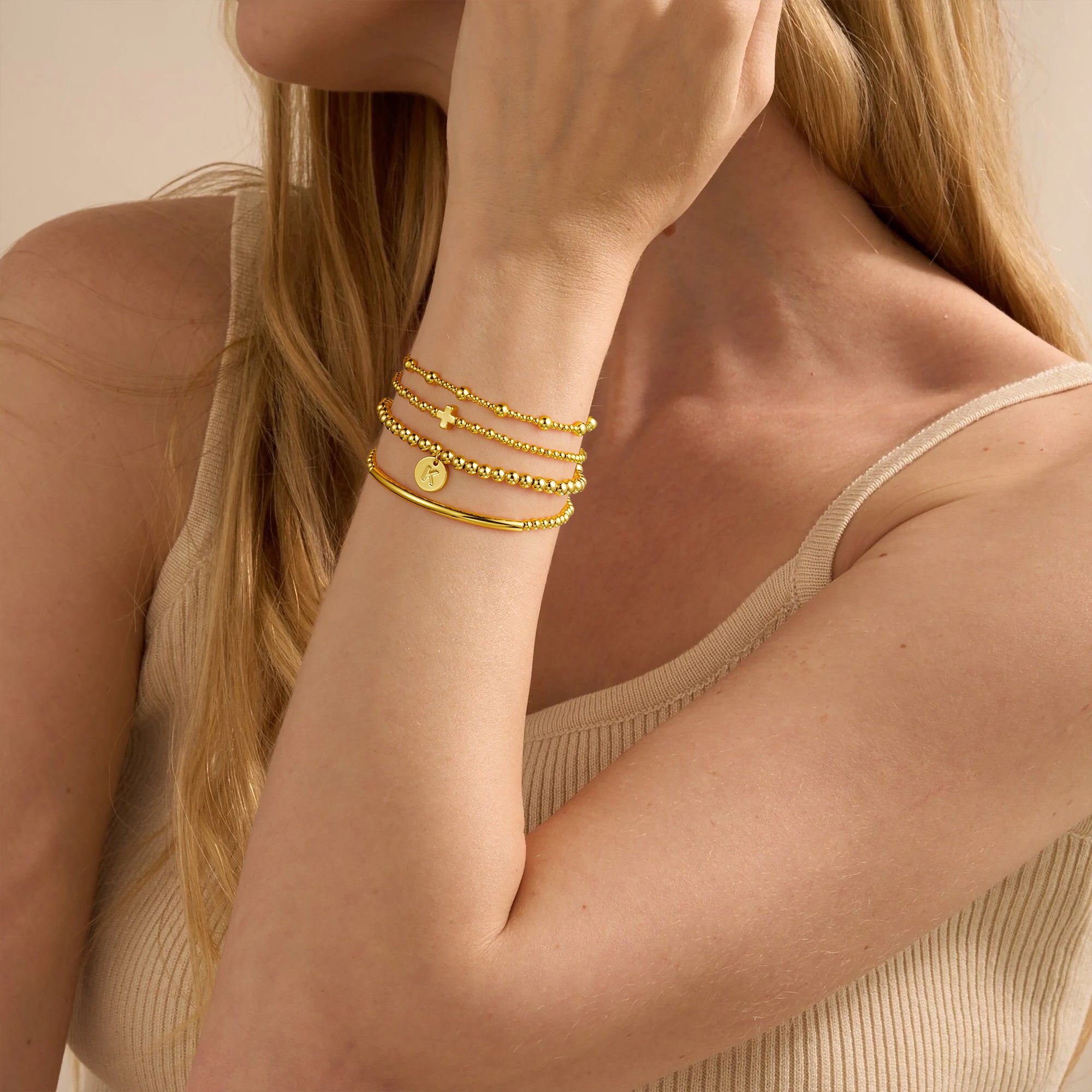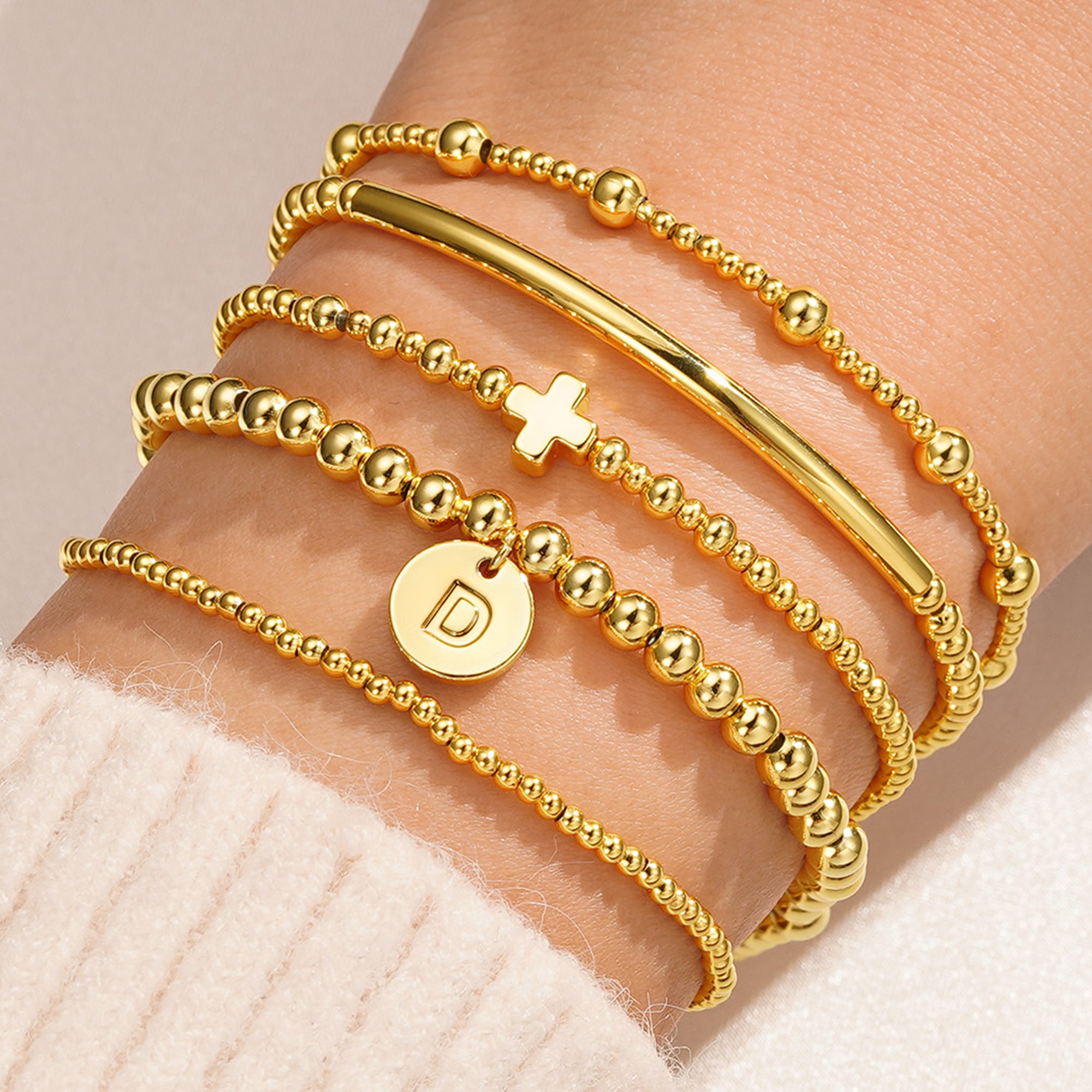 This five-layered stack bracelets for women perfectly blends industrial aesthetics with spirituality. It features exquisite stainless steel beads paired with personalized letters and a classic cross, creating a collectible piece of art that combines modern elegance with profound meaning. Crafted from high-quality hypoallergenic stainless steel beads, the gold initial cross bracelet is thickly plated with 18K gold, ensuring it's safe for those with sensitive skin while also imparting a luxurious, dazzling golden sheen. The five layers of chain create captivating shimmering effects on the wrist.