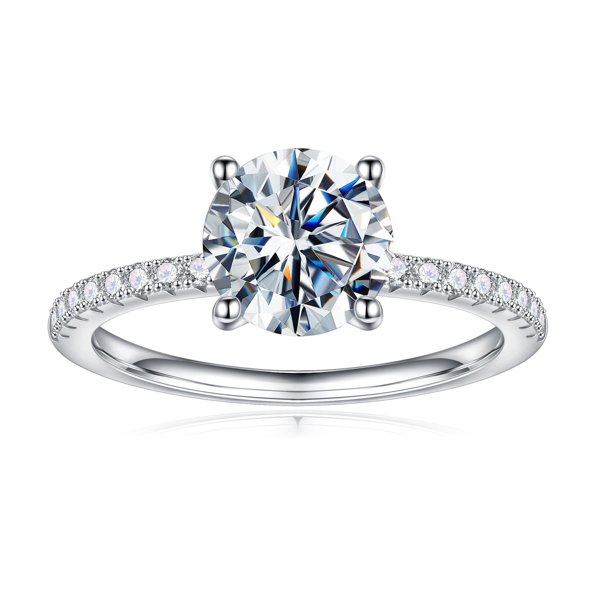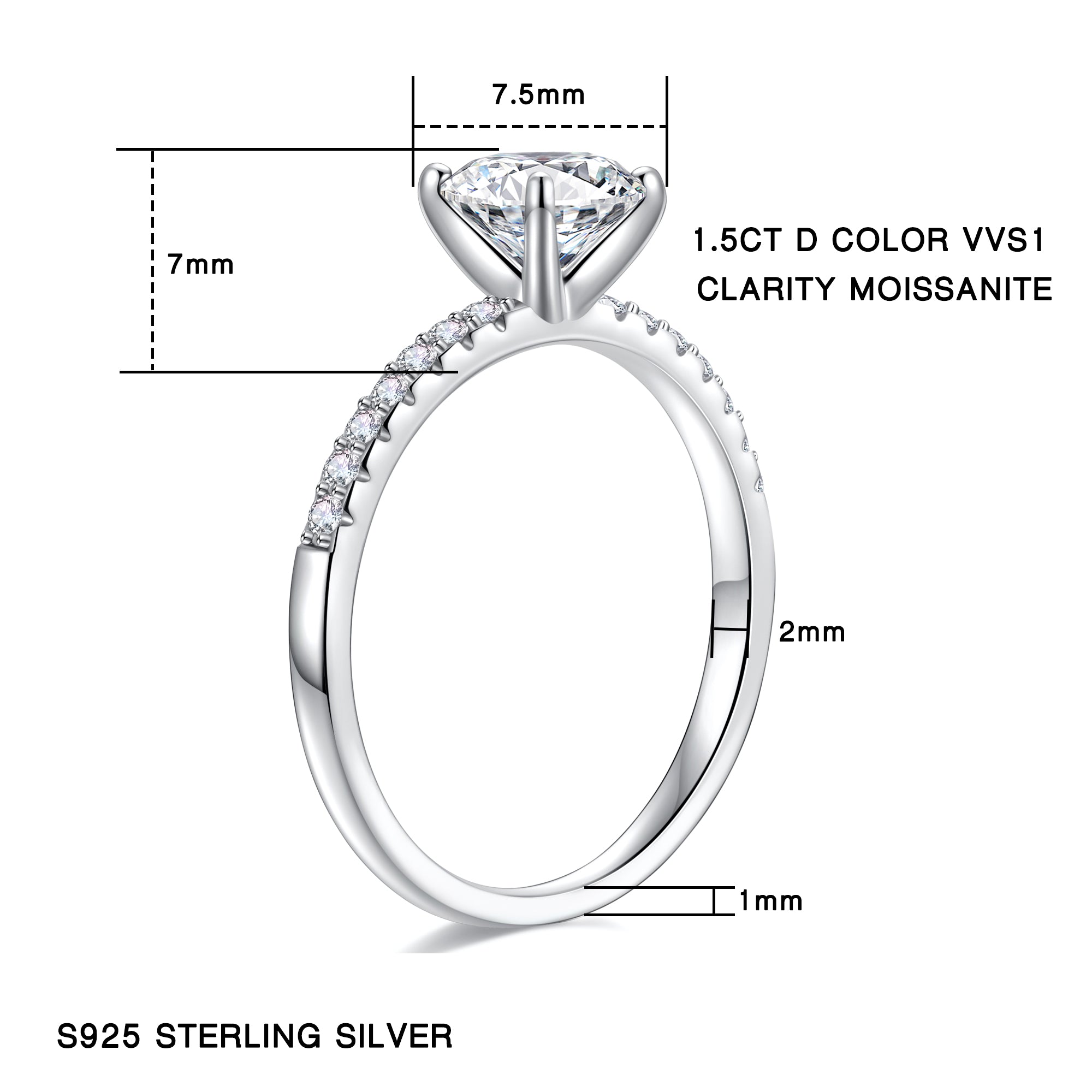 This exquisite silver diamond ring is available in eight precise sizes, from 5.5 to 9, each meticulously calculated for a comfortable fit. A carefully selected round moissanite is set at the center using a classic four-prong setting, ensuring both security and maximizing the stone's brilliance. Surrounding it are twelve white zircon stones, symbolizing the eternal cycle of the twelve months, creating a rich visual hierarchy and allowing the ring to radiate a captivating glow in the light.