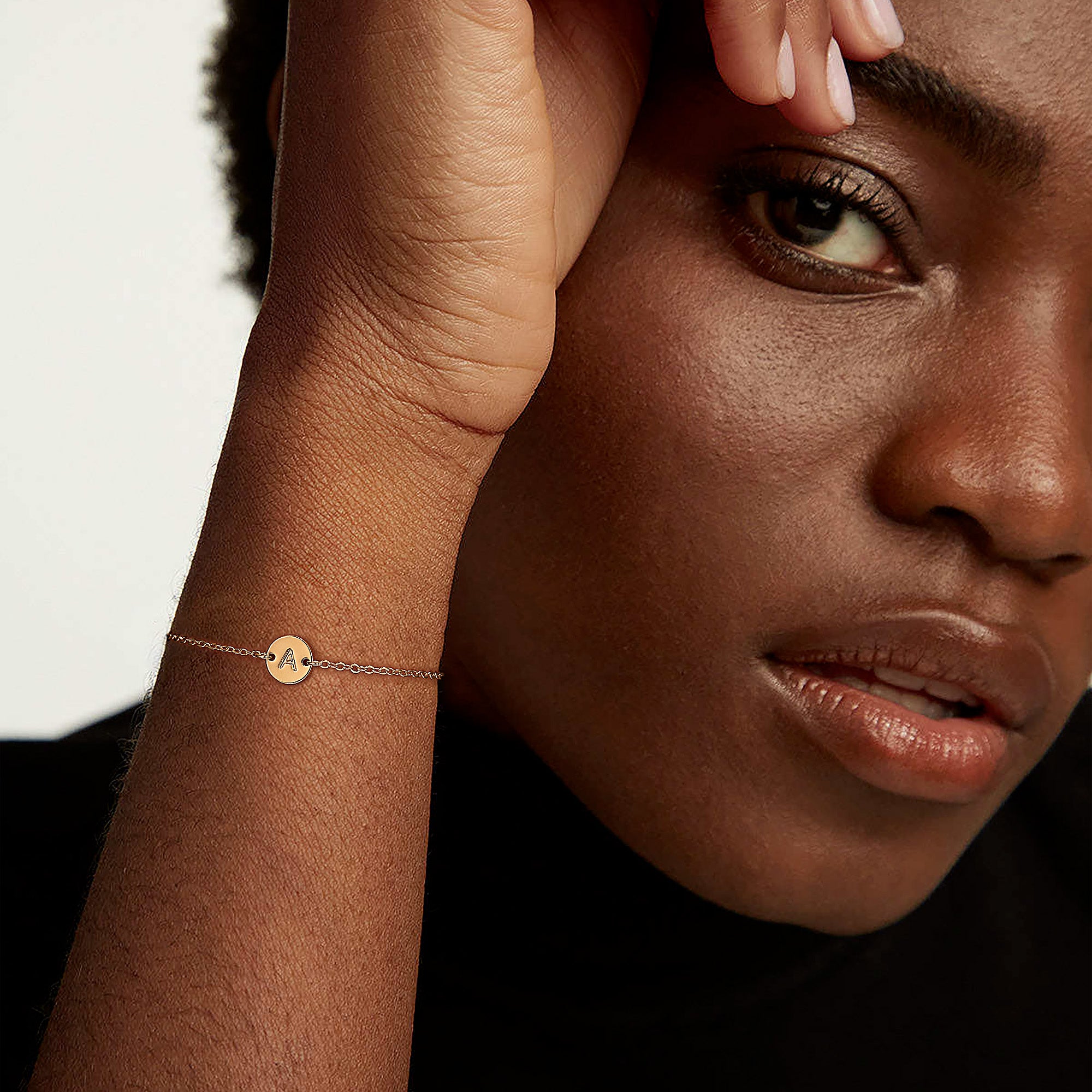This stylish gold initial bracelets for women perfectly blends industrial aesthetics with customization. It features 14 carefully selected disc letters and an innovative use of stainless steel, creating a modern and personal everyday accessory. This innovative material combination features a chain constructed from a high-grade hypoallergenic copper base with thick 18K gold plating, while the pendant is crafted from premium stainless steel. This ensures comfort and allergy-free wear while creating a unique visual dimension through the interplay of different materials.