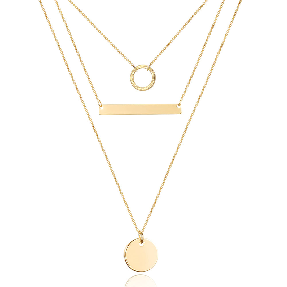 An elegant layered choker with circles, bars, and discs for a contemporary aesthetic.