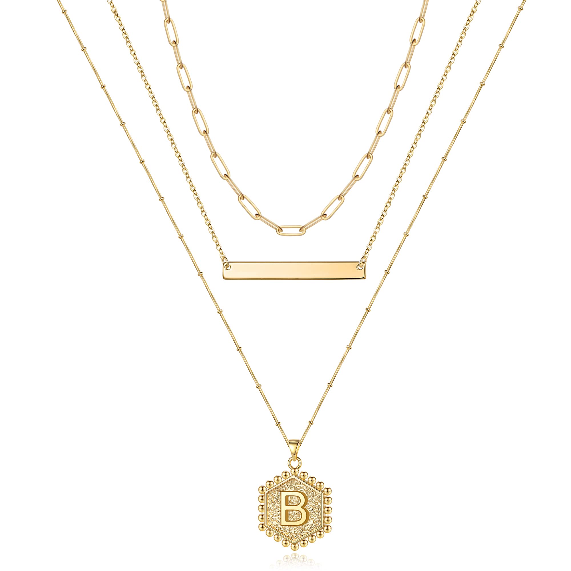Handmade 14K gold plated layered necklace featuring a hexagon letter pendant and beads chain. A perfect gift for any occasion, adding a personalized touch to your jewelry collection.