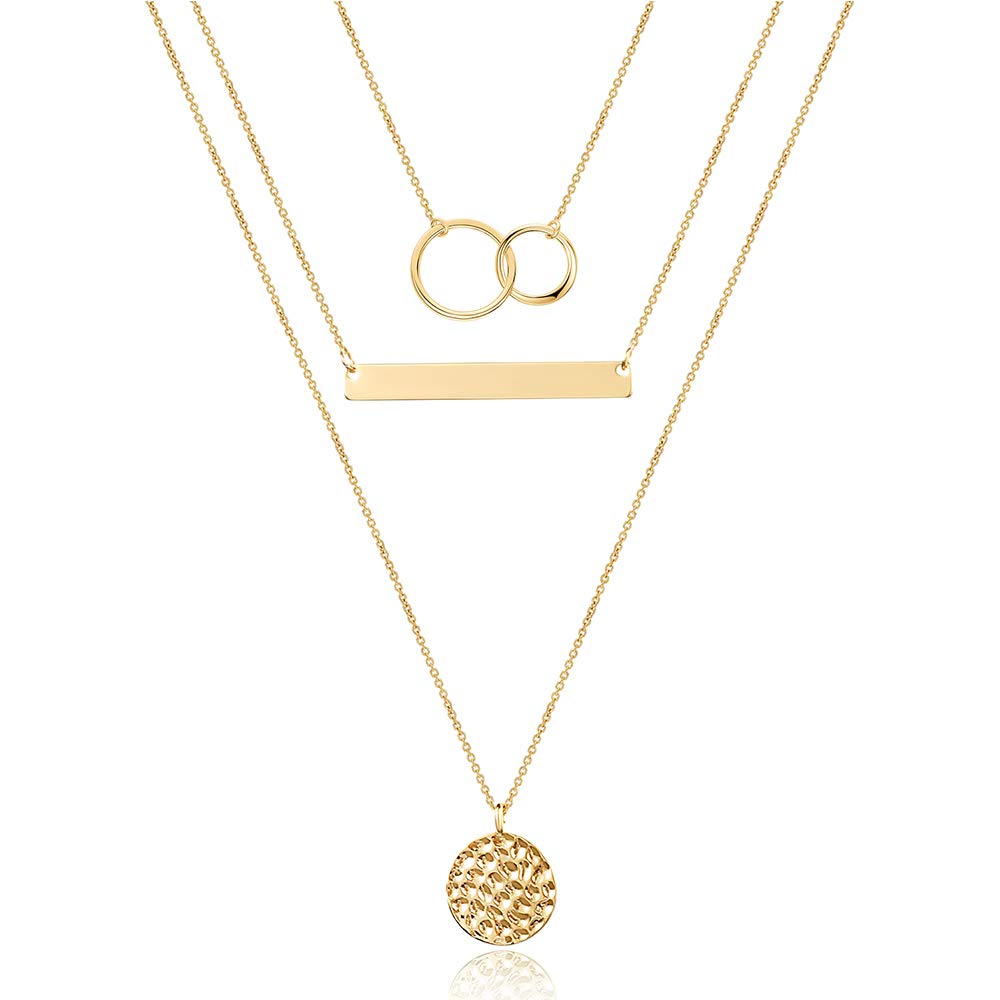 A stylish layered choker combining two circles, bars, and hammered discs for a trendy look.