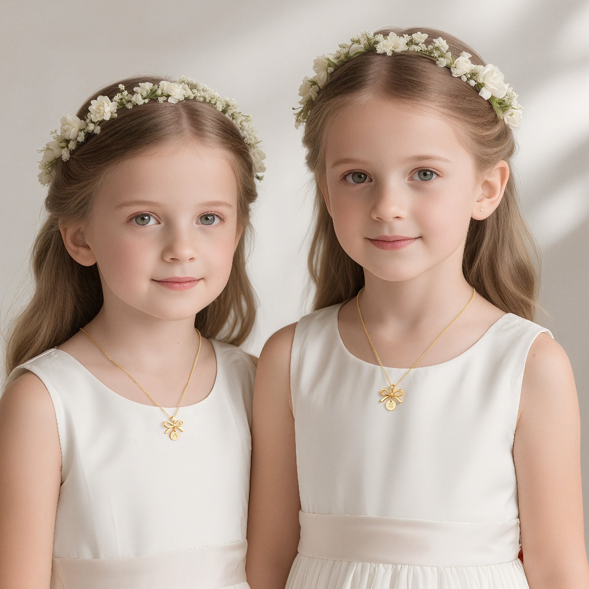 Carefully crafted for wedding moments, the gold flower girl bow disc pendant necklace captures the romance and eternity of a wedding in exquisite jewelry. This ceremonial gold necklace for girls features a base of high-grade hypoallergenic copper and a thick 18K gold plating, ensuring it's safe for those with sensitive skin while also imparting a luxurious, dazzling golden luster, allowing every wearer to radiate their special day.