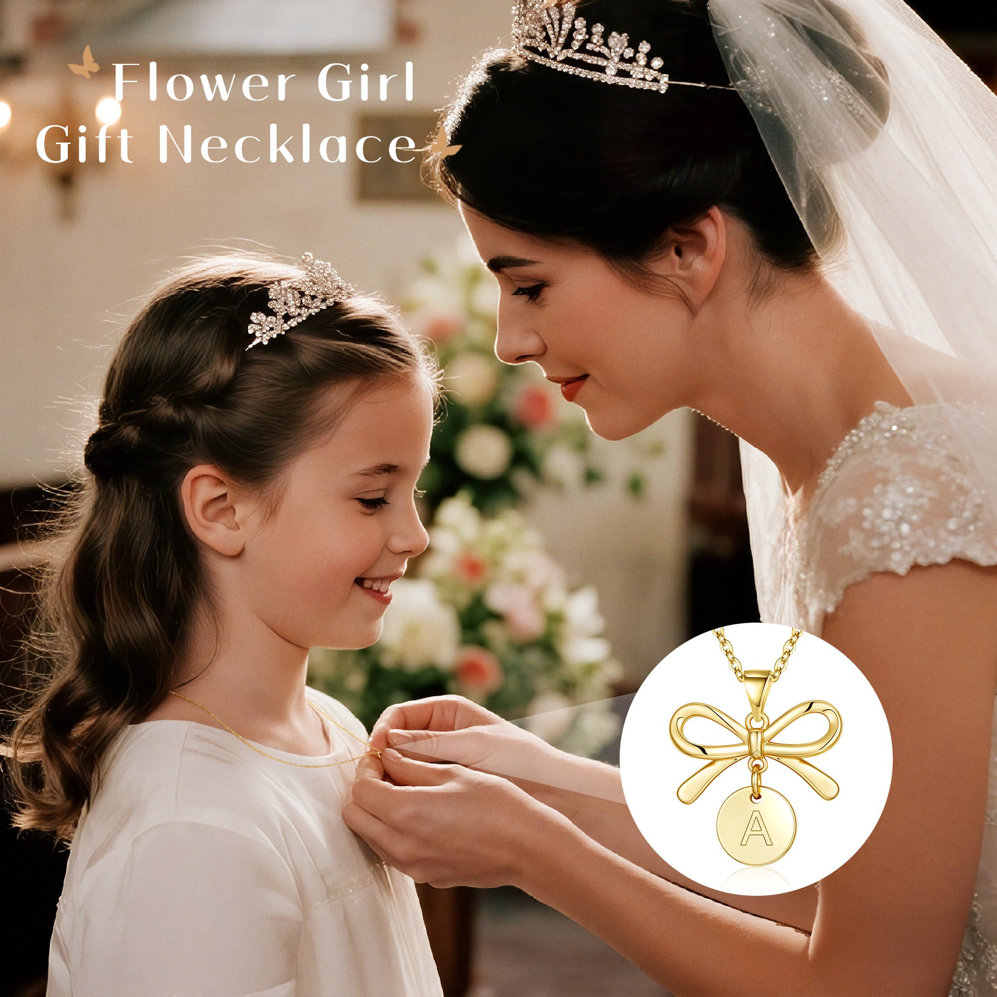 Flower Girl Bow Disc Initial Necklace for Girls Women - A Timeless Memory of Wedding Joy