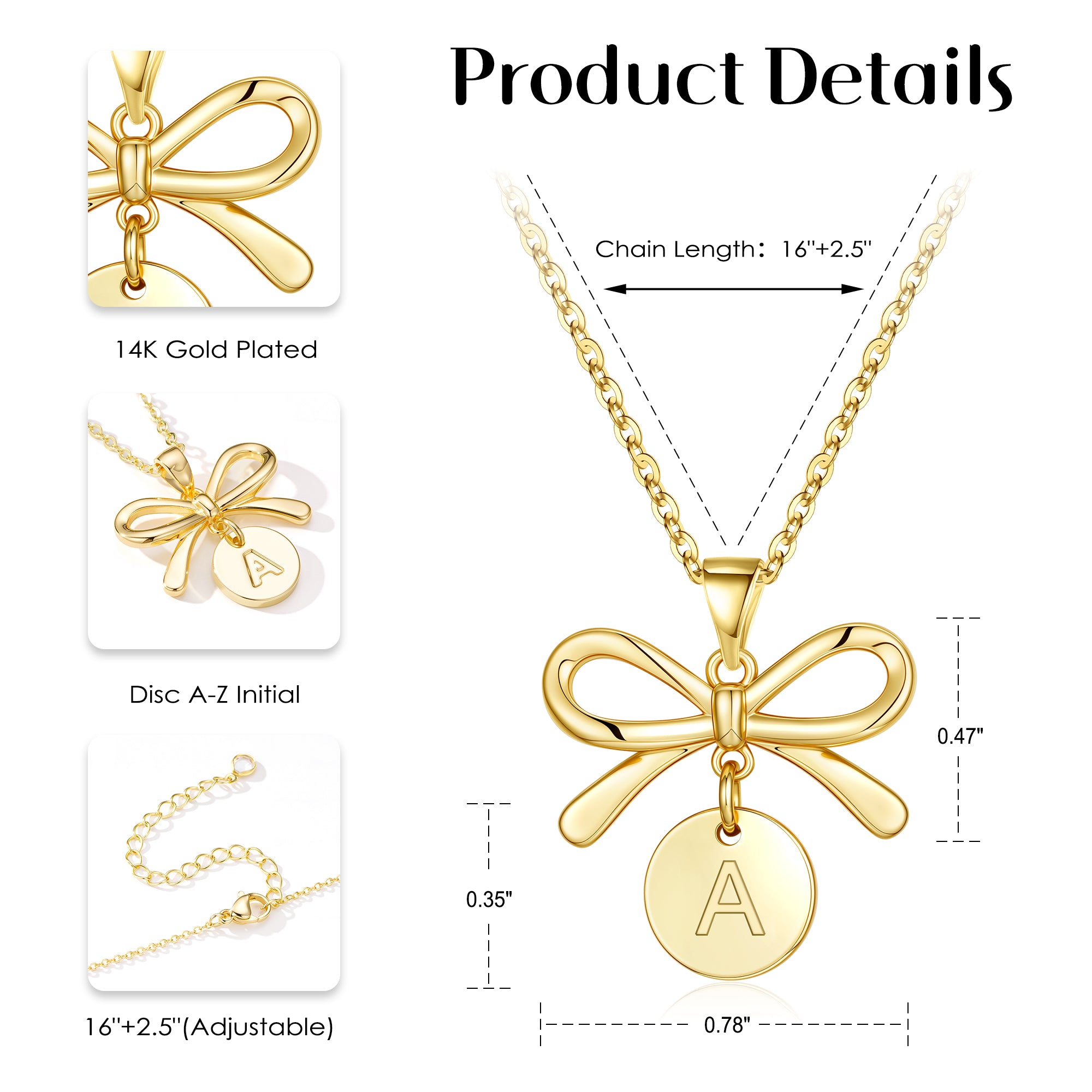 The danity gold necklace offers 26 letters from A to Z and can be customized with the initials of the flower girl or bridesmaid, creating a unique wedding commemorative gift. The pendant perfectly combines a delicate bow with a letter disc. The surface of the bow pendant is polished, smooth and shiny resembles the delicate ribbon on a wedding gown, symbolizing purity and beauty. The letter disc is laser-engraved for elegant, clear lettering, forever etched with the recipient's individual identity.