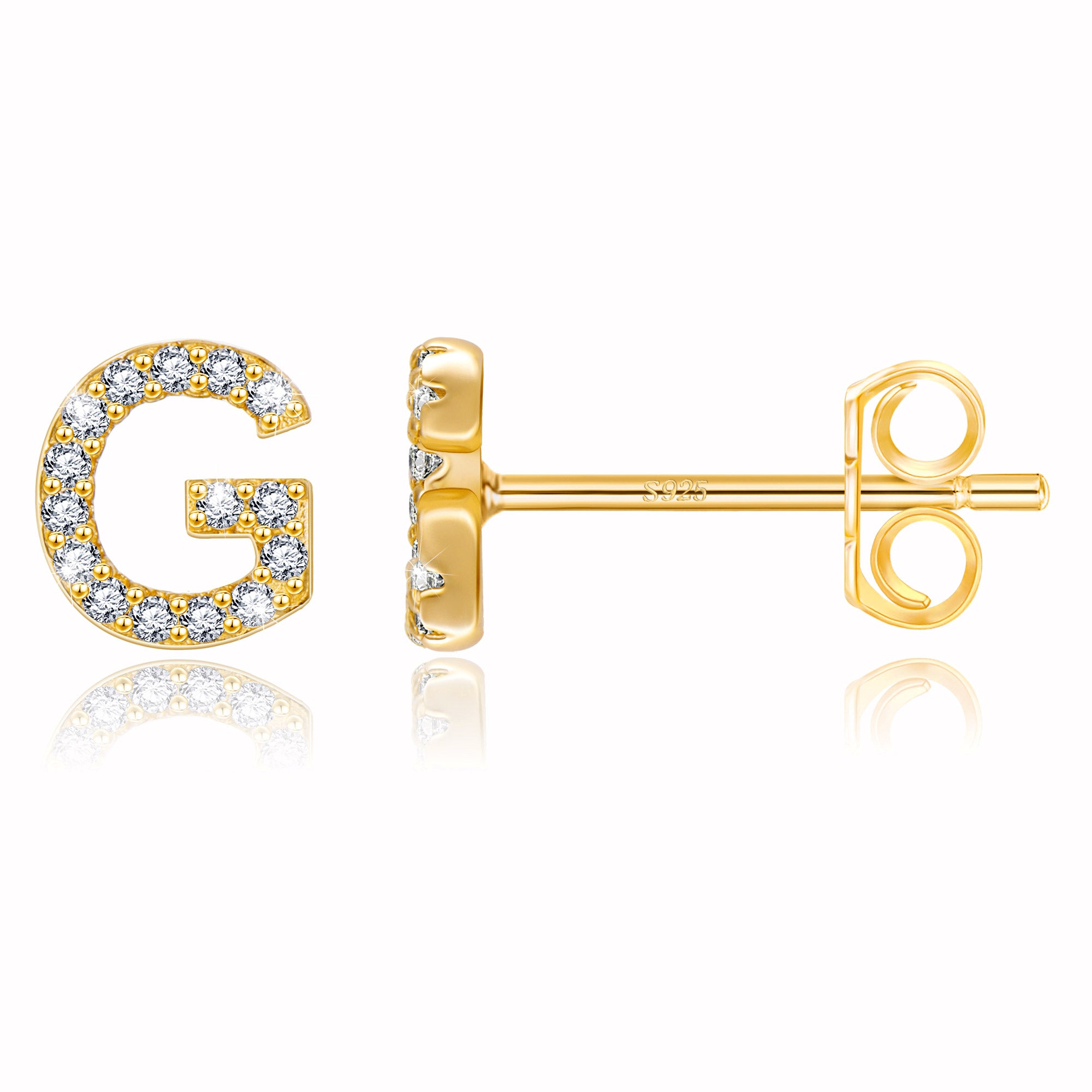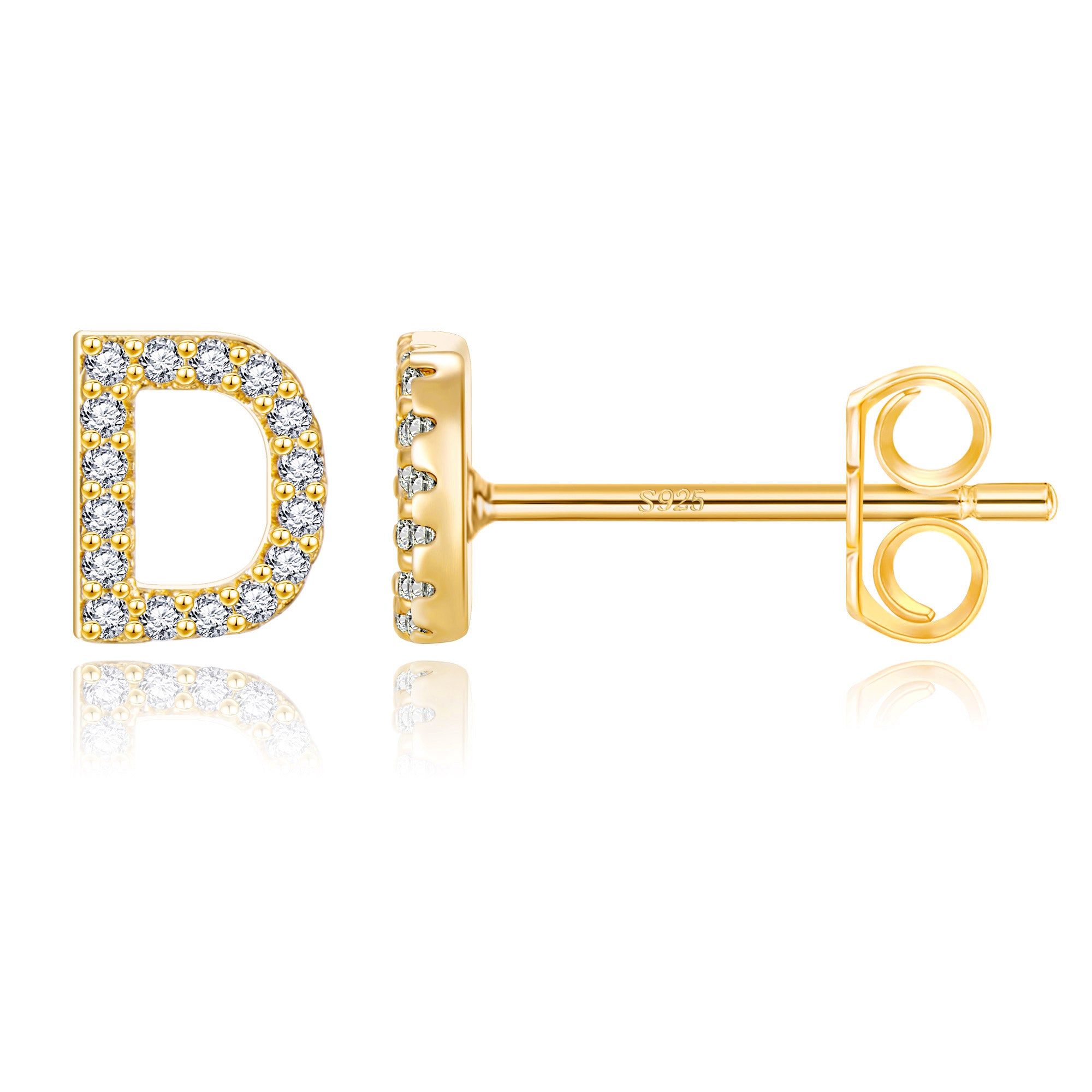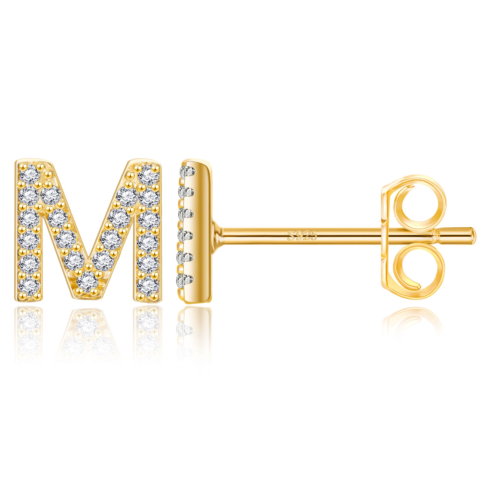 These exquisite gold stud earrings feature a precisely designed 8mm x 7mm letter size, perfectly balancing visual beauty and wearing comfort. The 14 selected letter designs are micro-set with high-quality zircon stones. Each zircon is DEF-grade colorless, and the precise faceting ensures maximum brilliance. The standard 0.8*10mm S925 sterling silver earrings ensure a comfortable and secure fit. Two ear tips are also included: a classic copper butterfly tip for everyday comfort and stability, and a stylish saucer tip for extra security, perfect for every occasion.