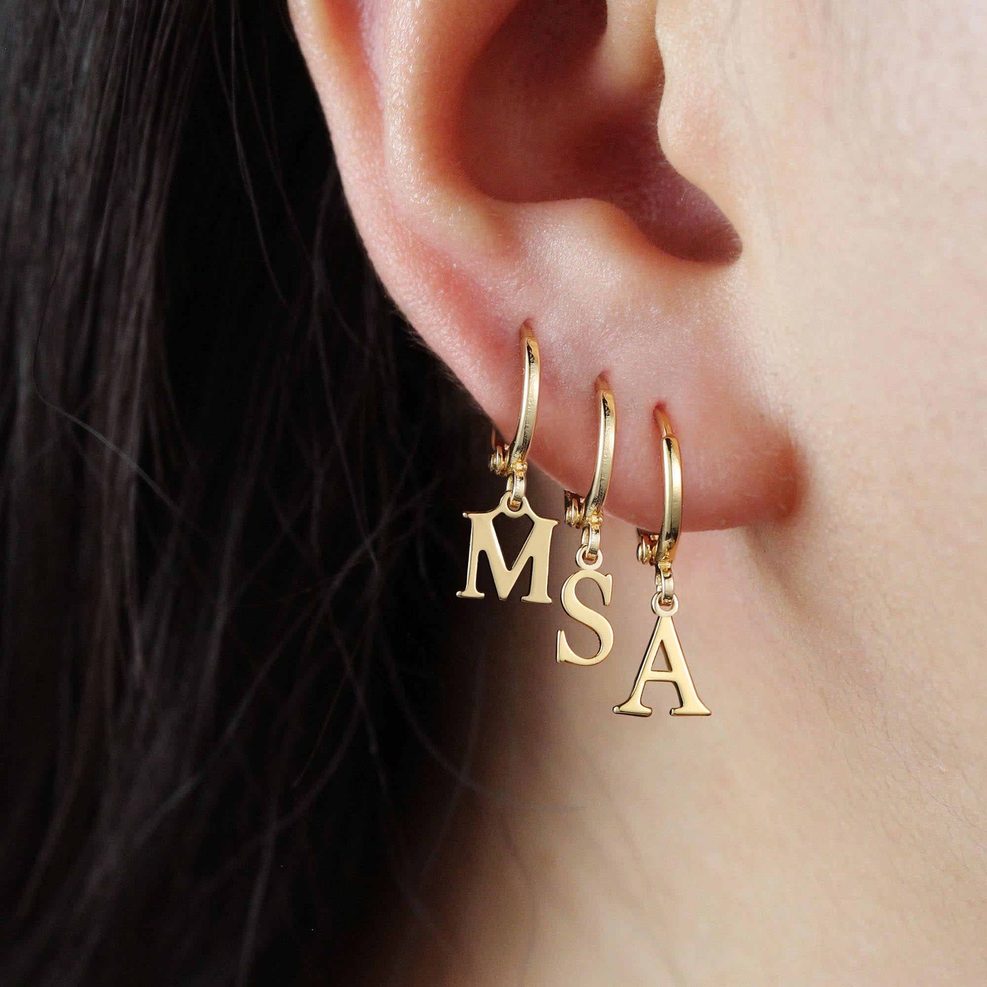 These exquisite gold hoop earrings feature meticulously calculated dimensions: the polished earrings have an 8.5mm inner diameter and a 2mm wire thickness, perfectly fitting the contours of the earlobe and creating an elegant curve. The 7mm copper-cut polished letters, without the loop, are laser-engraved in 14 selected letter designs, suspended in the center of the round earrings, creating a clean, modern aesthetic. The specially designed 6.5mm copper curved pins with a fine 0.9mm thickness ensure a comfortable and secure fit. The overall design is centered around geometric aesthetics, while the polished finish creates a delicate luster. The floating letters create a dynamic visual effect, perfectly balancing personal expression with everyday wearability.
