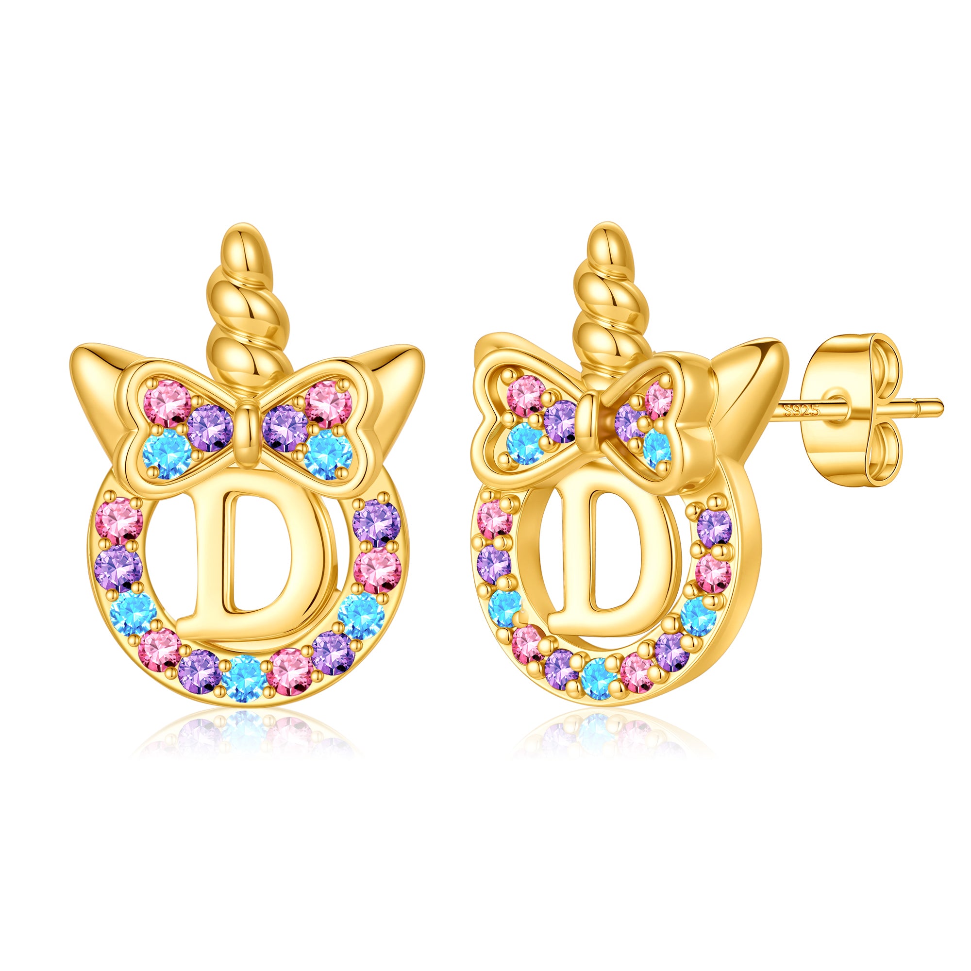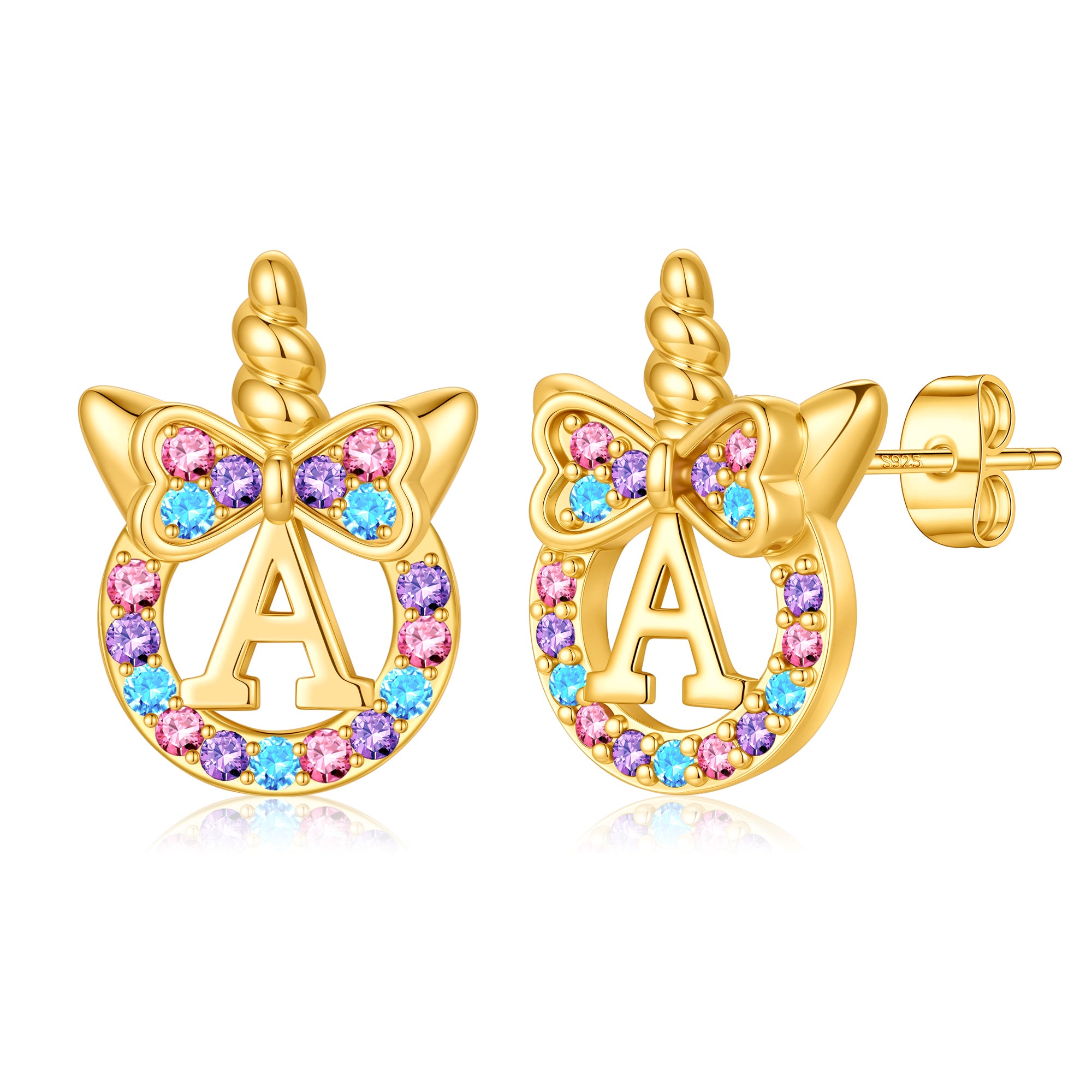 Introducing this Unicorn initial earrings for women, a perfect fusion of dreamy unicorns, dazzling zircons, and personalized letters. Using a round, polished surface as the canvas, zircon letters are embellished with sparkling glitter, and crowned with the unicorn's magical horn, creating a treasured gold stud earring that embodies fairytale fantasy and personal expression. Made from high-quality hypoallergenic copper with a thick 18K gold plating, these earrings not only ensure comfortable wearing but also impart a luxurious, dazzling golden luster. Specially crafted 925 sterling silver posts provide a protective layer for sensitive earlobes, ensuring uncompromising dreamlike beauty.