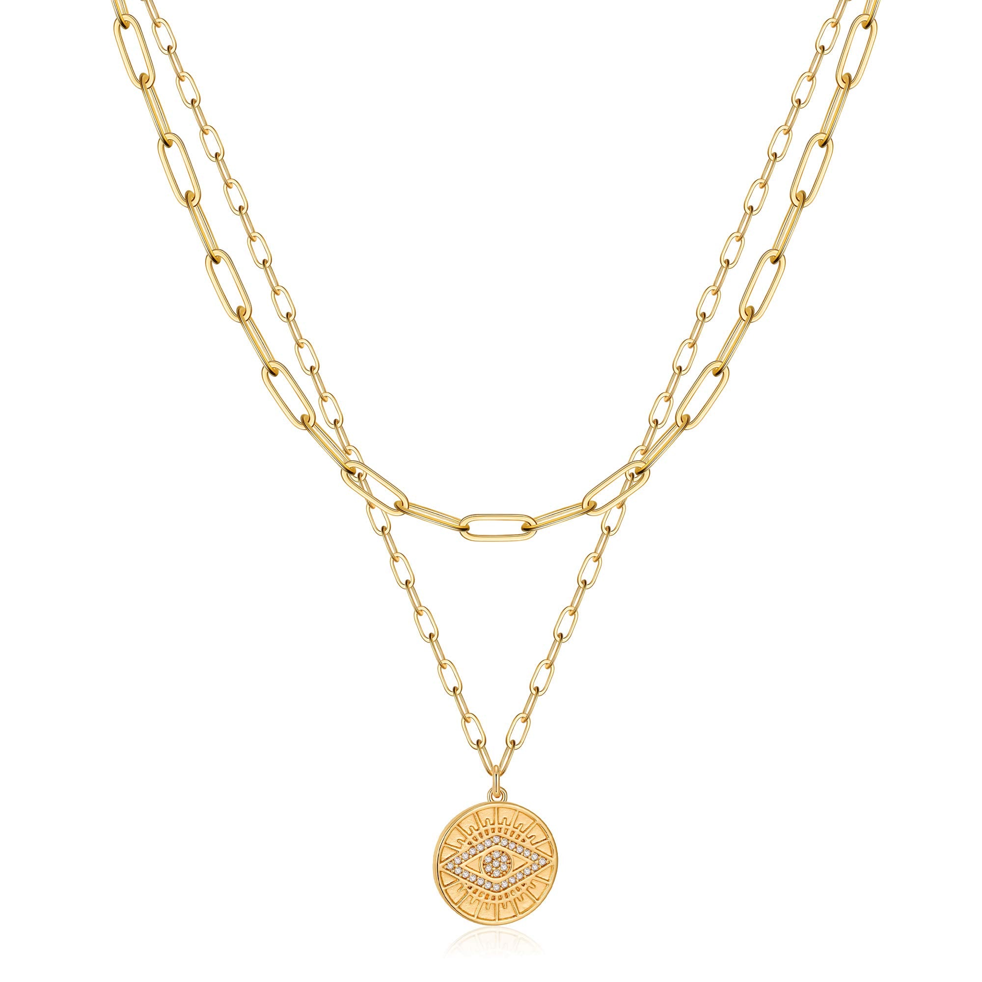 Trendy layered necklaces featuring the protective evil eye symbol, perfect for everyday wear.