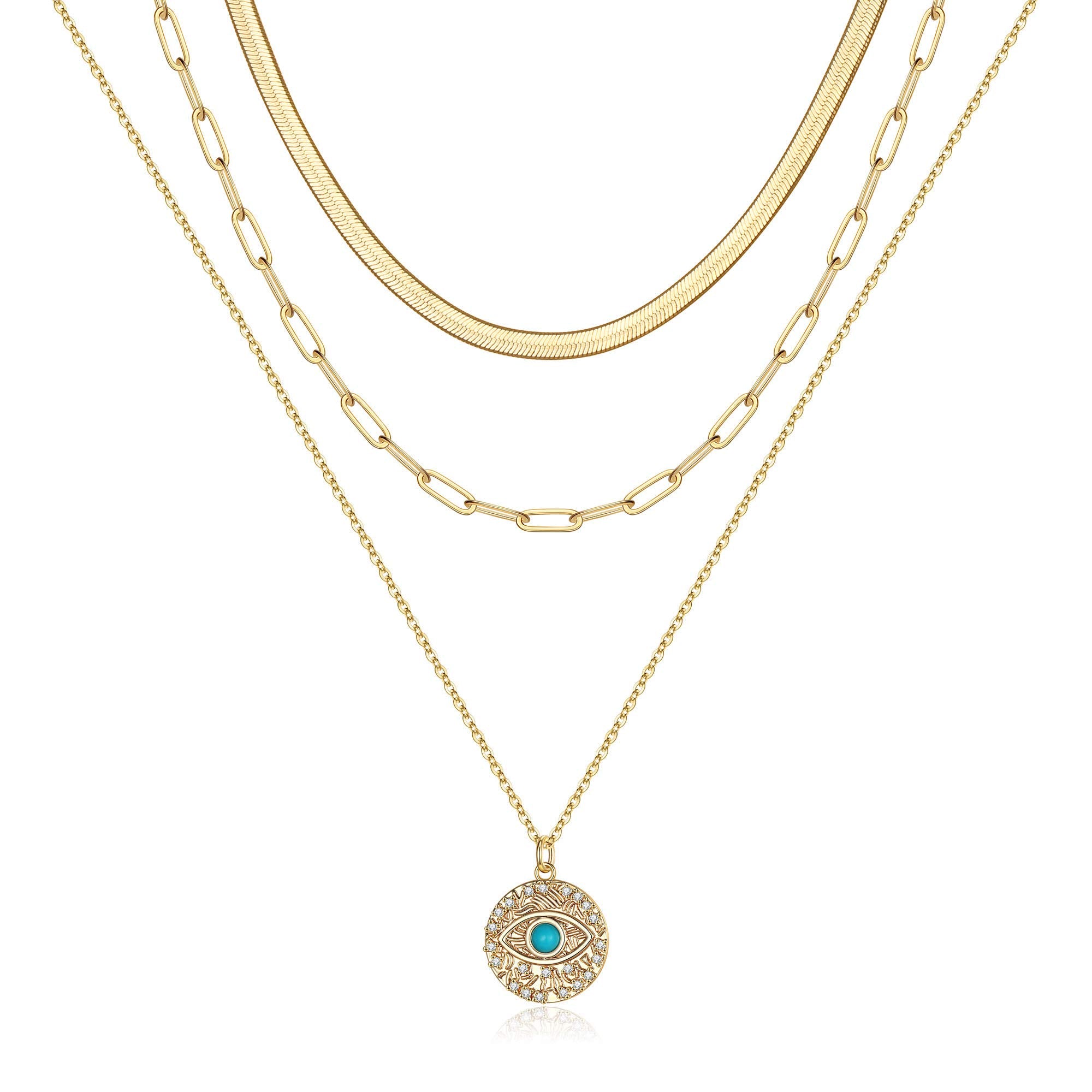 A stylish layered choker featuring snake and link chains, adorned with an evil eye charm.
