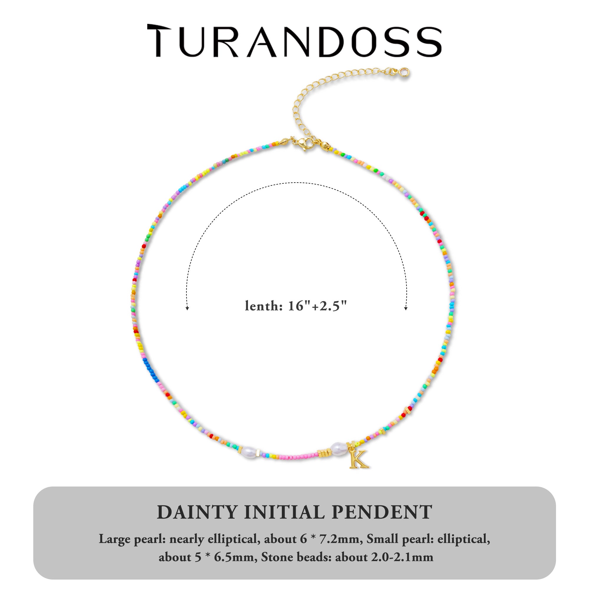 This vibrant initial necklace offers a choice of 26 letters from A to Z. Each letter pendant is laser-engraved for elegant clarity and a mirror-polished finish. The letters are cleverly strung with colorful glass beads and pearls, creating a vibrant visual effect. The blue glass beads are as clear as the ocean, the pink beads are as soft as cherry blossoms, and the white pearls are as warm as moonlight, creating a striking contrast against the gold letters. The bead necklace's standard 16-inch length is complemented by a thoughtful 2.5-inch extender chain, which can be adjusted with a high-quality lobster clasp. It perfectly complements any outfit and can be worn alone to create a statement or layered with other necklaces for a stylish look.