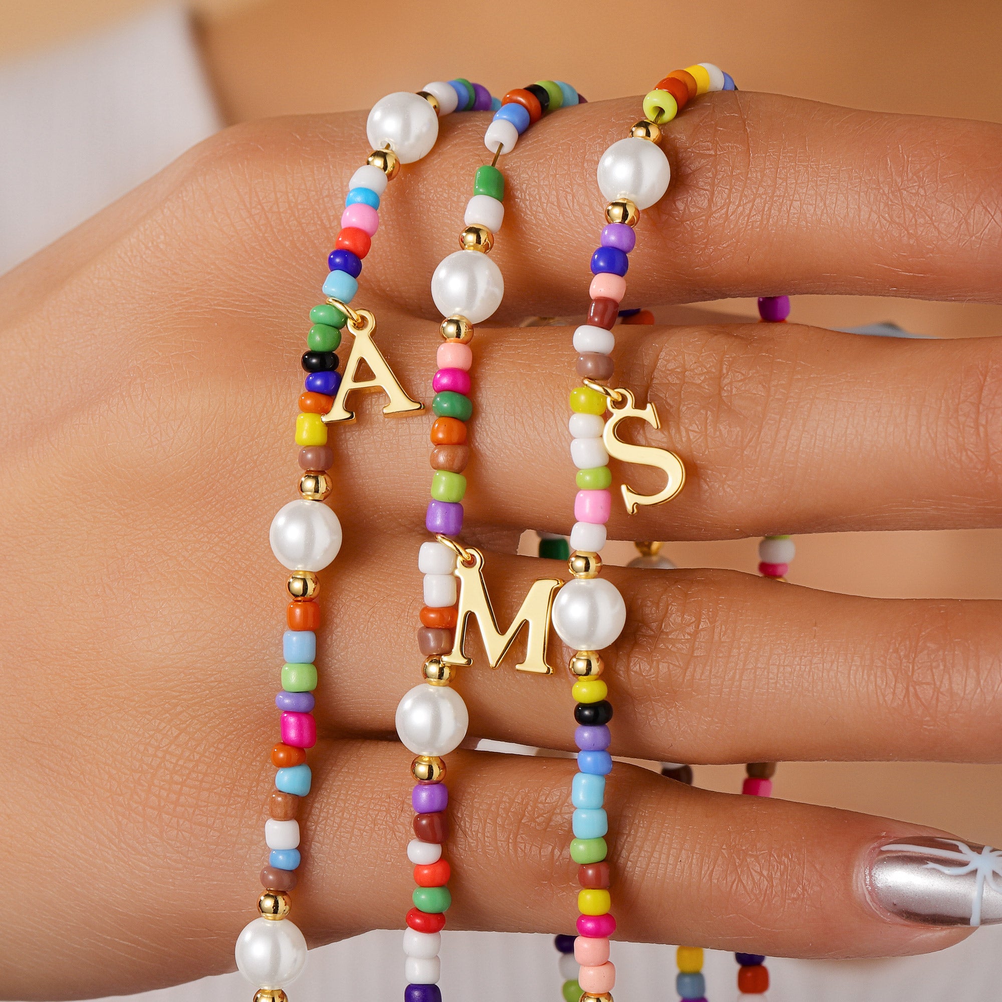 This stylish beaded initial necklace perfectly blends vibrant colored beads with gilded letters. This creative combination of colorful glass beads, lustrous pearls, and personalized letters creates a vibrant and artistic piece of jewelry. The pendant is constructed from high-grade hypoallergenic copper and plated with a thick layer of 18K gold, ensuring it's safe for those with sensitive skin (including women and girls) while also imparting a luxurious, dazzling golden luster. The colored glass beads are hand-polished with a highly translucent material, and the pearls are carefully selected from premium synthetic pearls. Each bead is meticulously screened to ensure uniform color and a smooth surface.