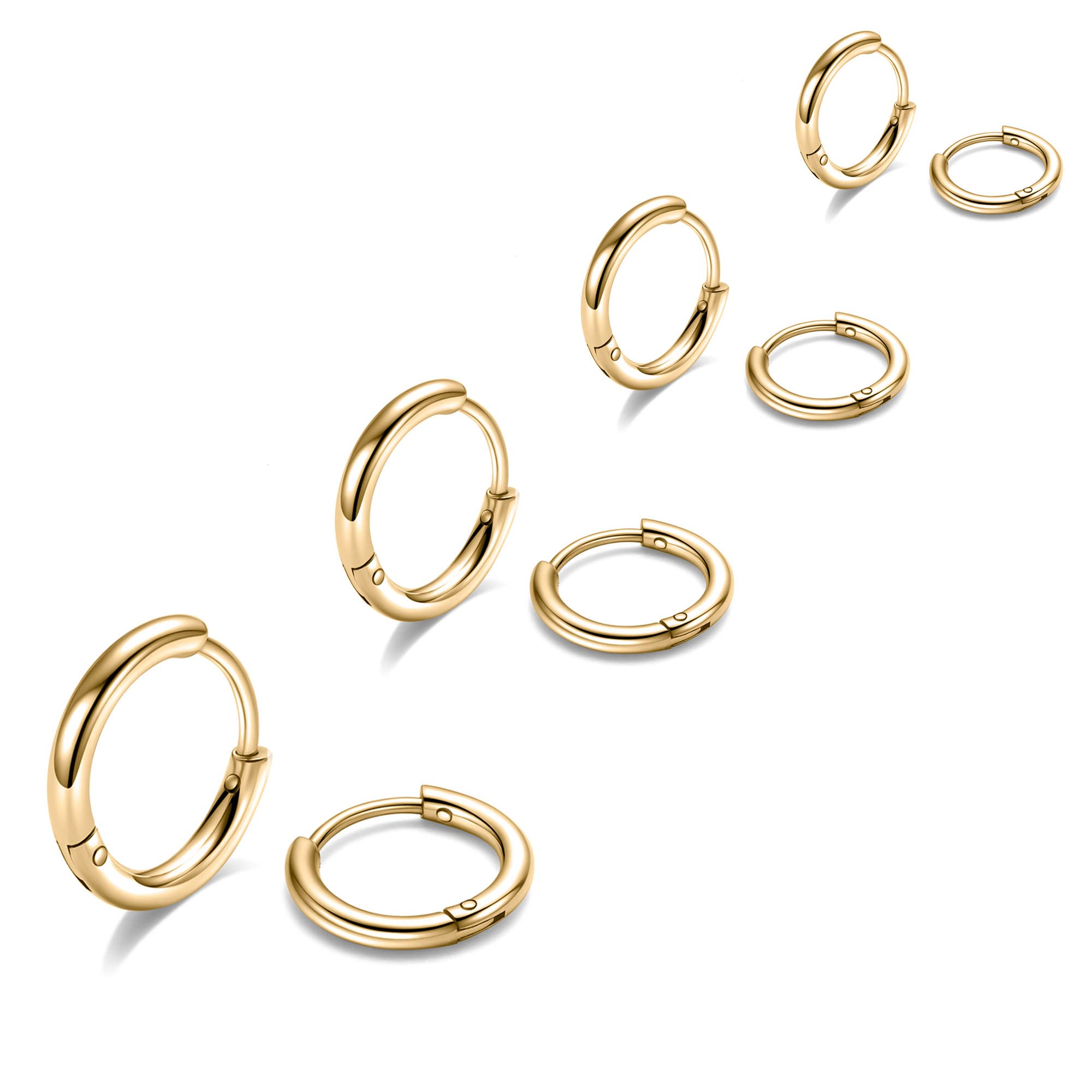 Introducing this gold hoop earrings set, a perfect blend of minimalist aesthetics and practicality. Available in four precisely calculated sizes and two-tone colors, those silver huggie earrings are a collectible piece that transcends gender boundaries. Made from medical-grade hypoallergenic stainless steel, it's plated with 18K gold and sterling silver, ensuring safety for even the most sensitive skin while retaining its metallic shine for years to come.