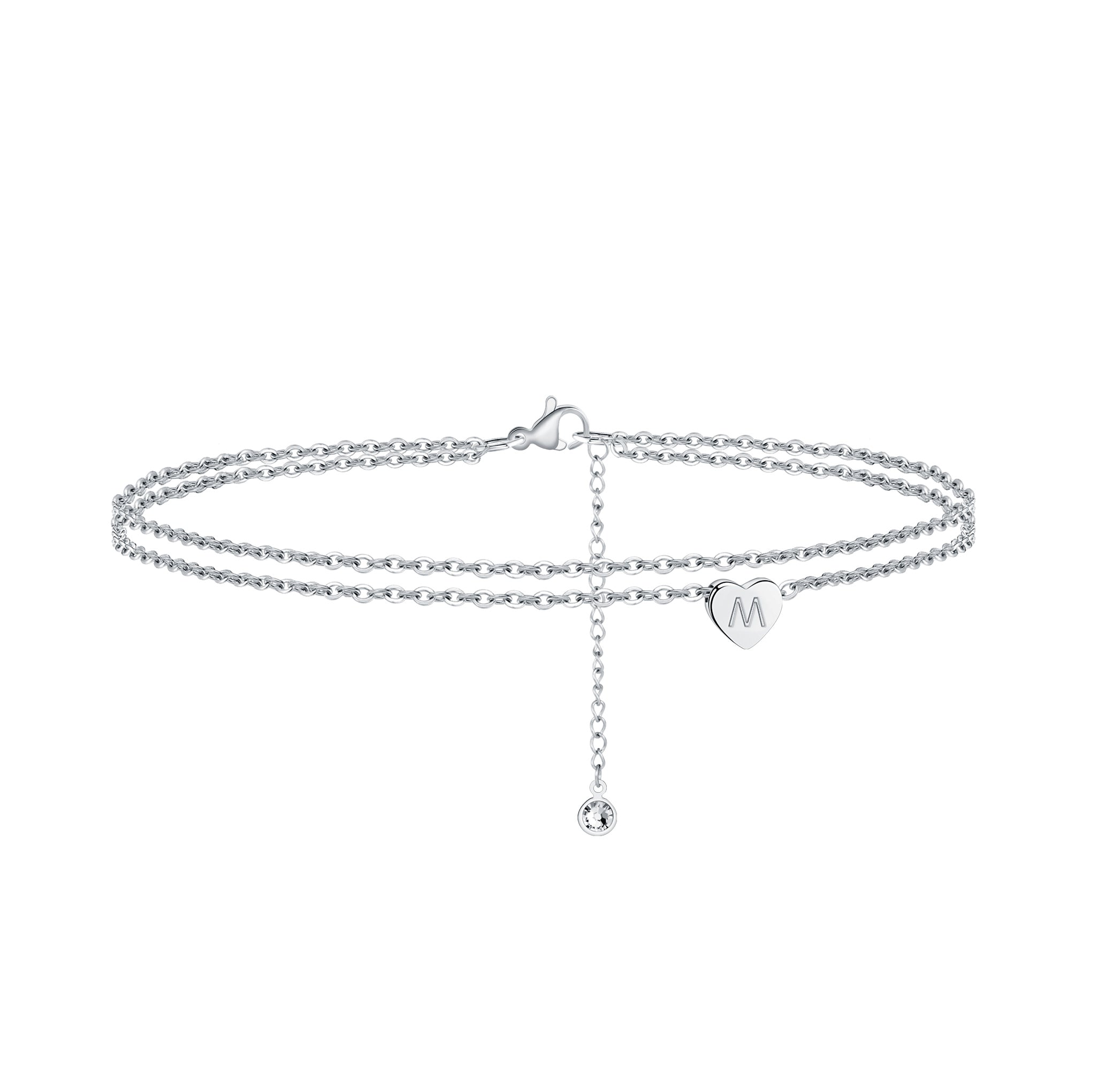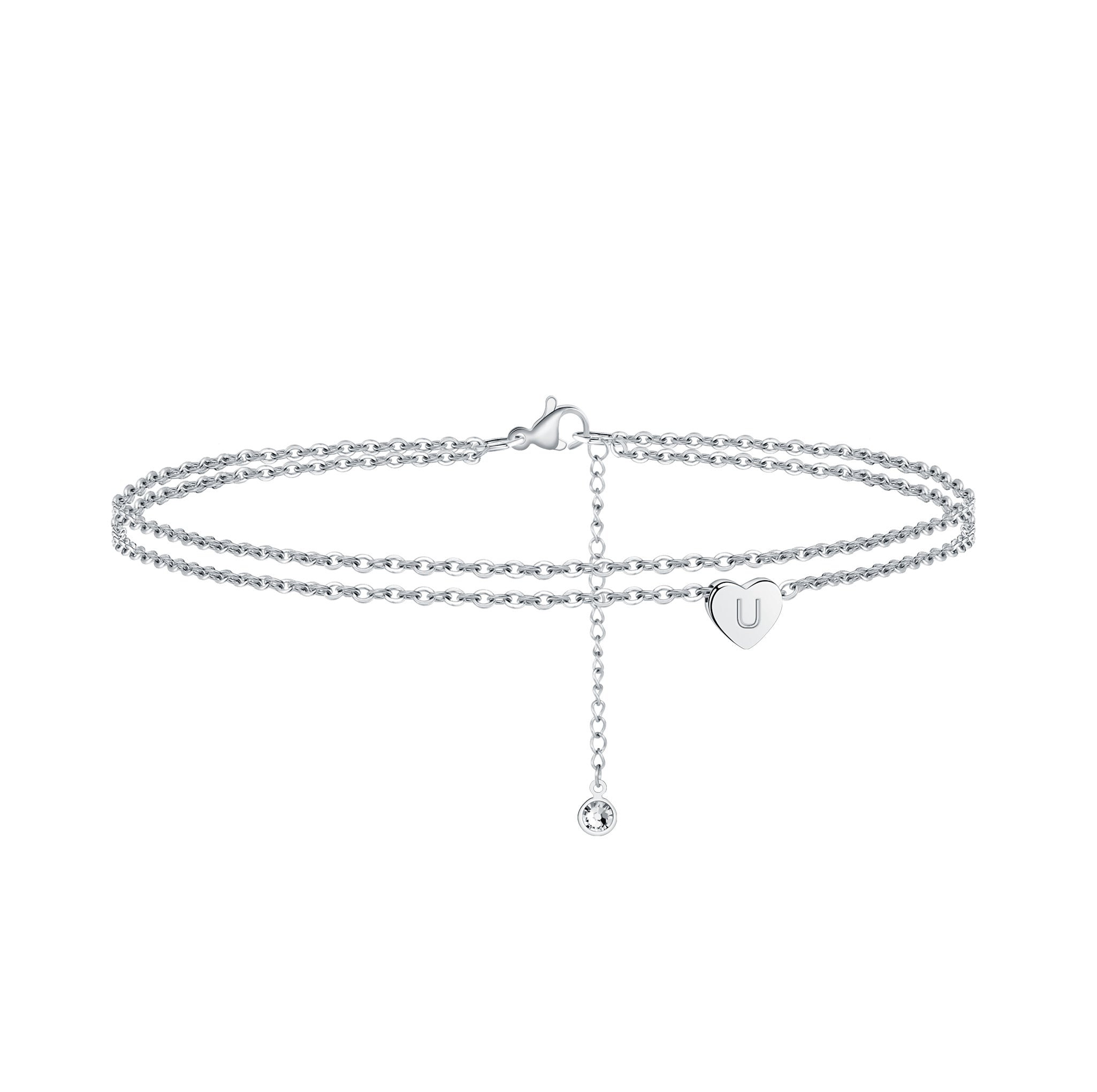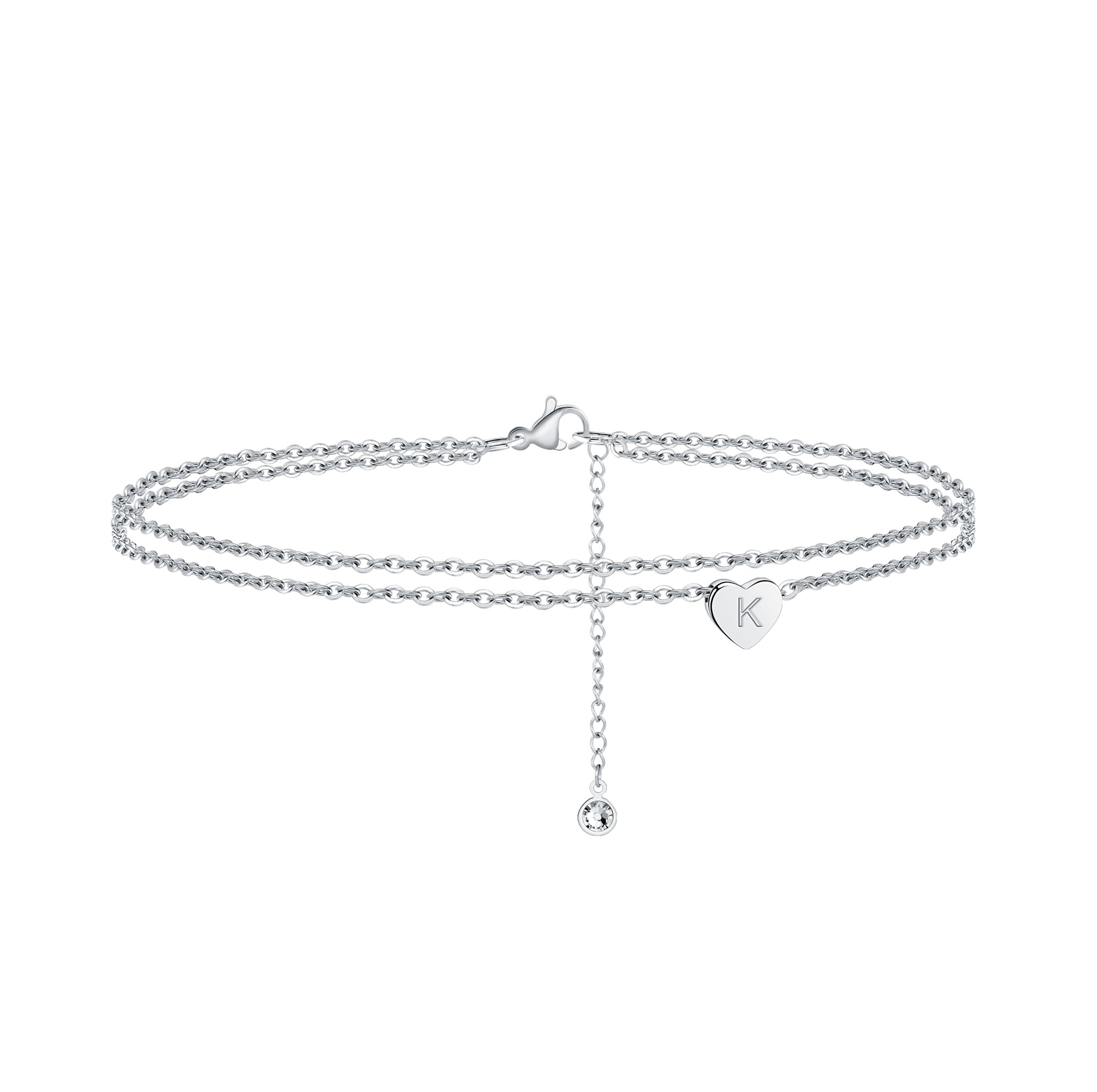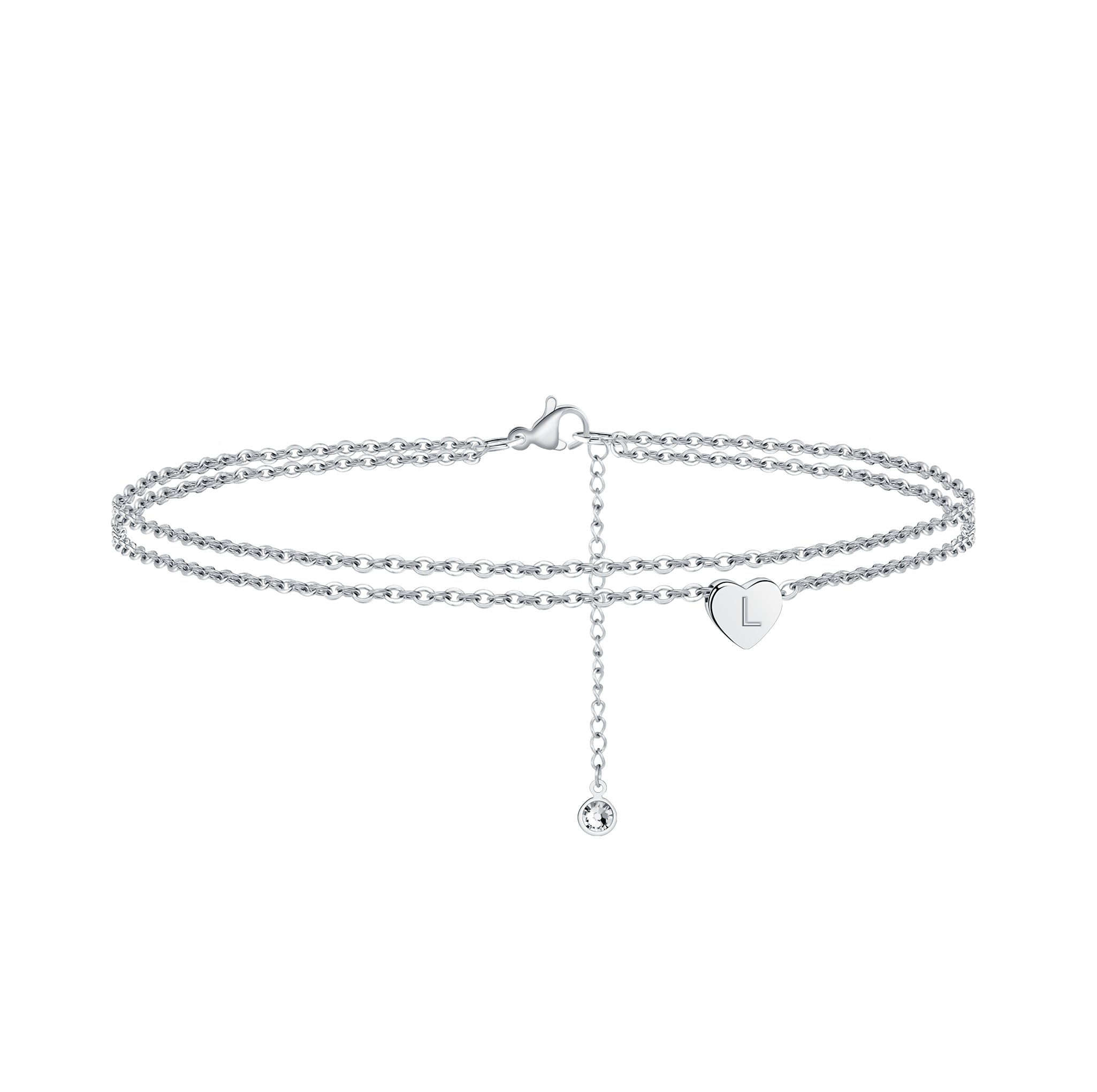 Dainty layered silver ankle bracelets featuring heart initials, handmade with 14K white gold filling—perfect for summer and beach wear.