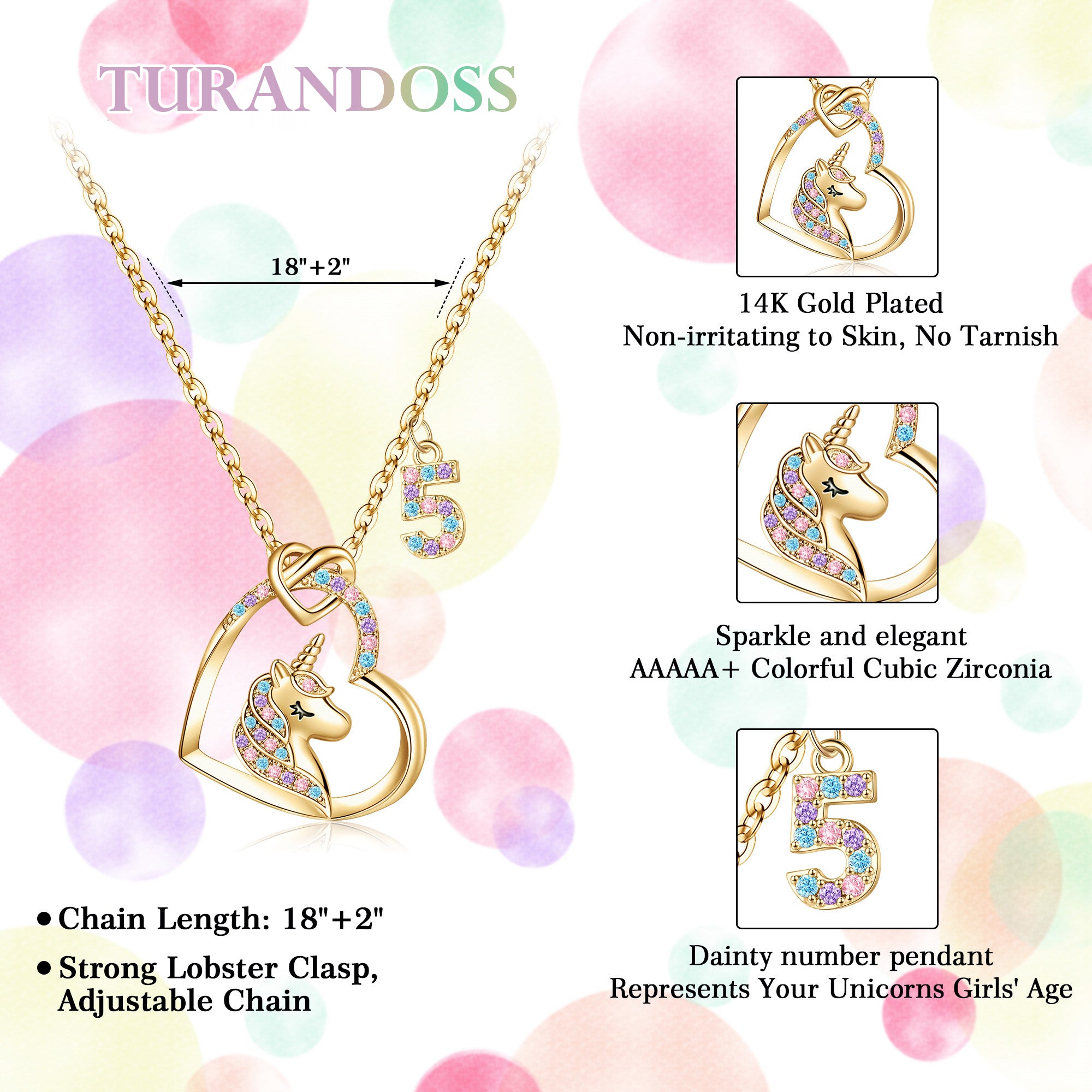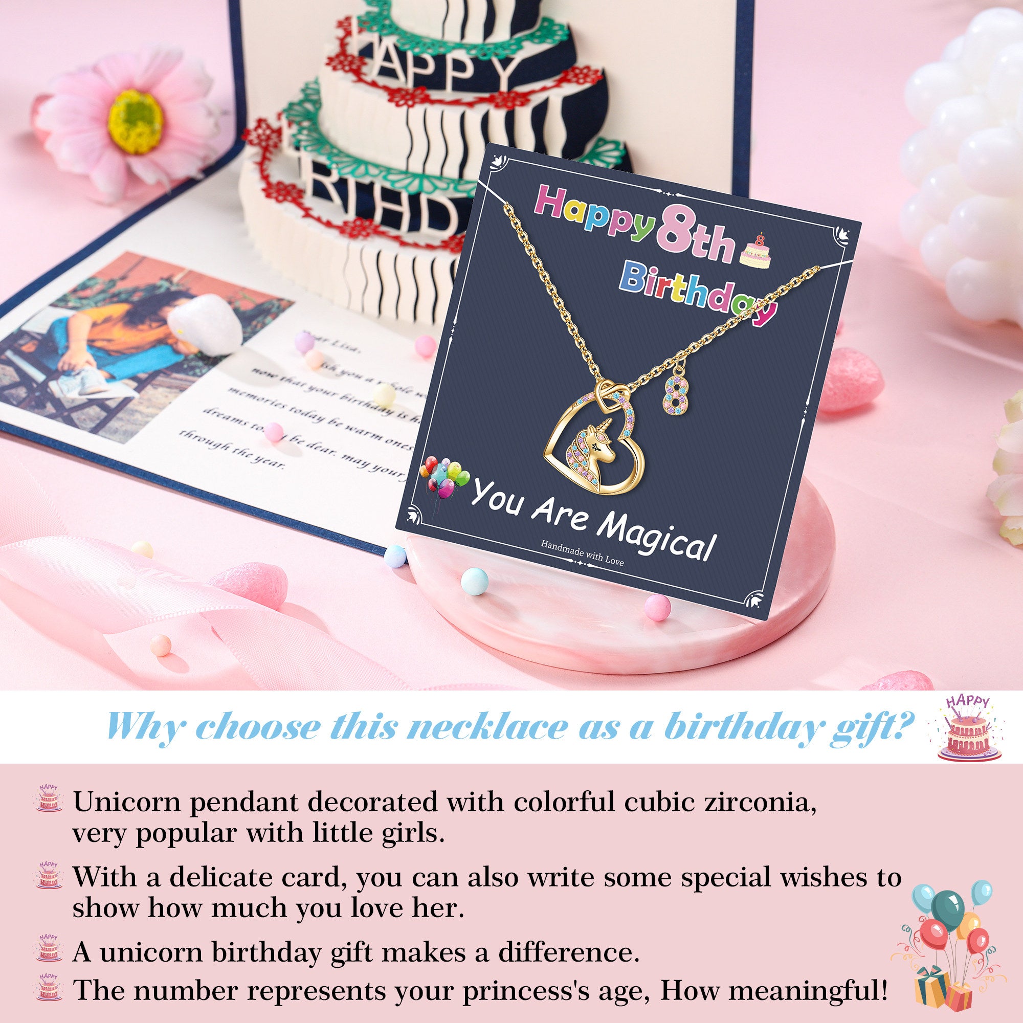 This commemorative unicorn necklace offers six age numbers, from 3 to 8 years old, and features a beautiful dual pendant design. The main pendant is a dreamy heart-shaped unicorn, embossed with a 3D relief technique, featuring gently rising spiral horns and a delicate, vivid texture. The heart's edges are meticulously inlaid with DEF-grade zircons, shimmering like magical stars. The secondary pendant features a custom-designed age number pendant, beautifully laser-engraved with a mirror-polished finish and inlaid with zircons, capturing your child's most precious moments. The thoughtful 18-inch standard length with a 2.5-inch extender chain allows for flexible adjustment via a high-quality, secure lobster clasp, making it a perfect gift for girls aged 3-8.