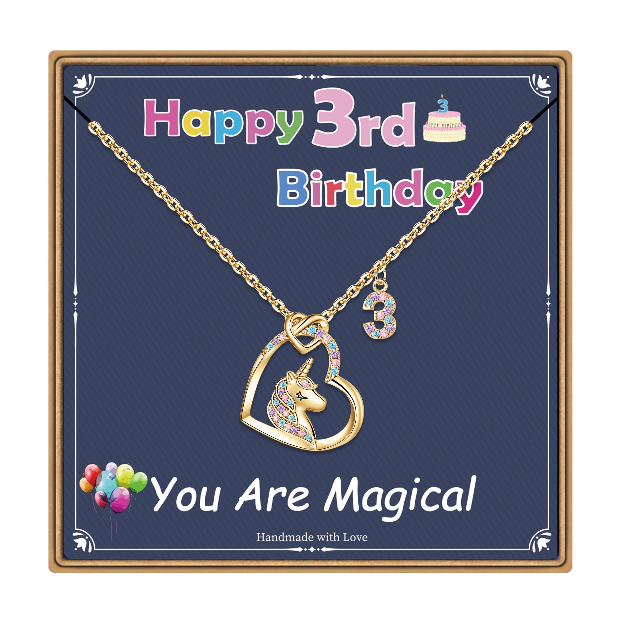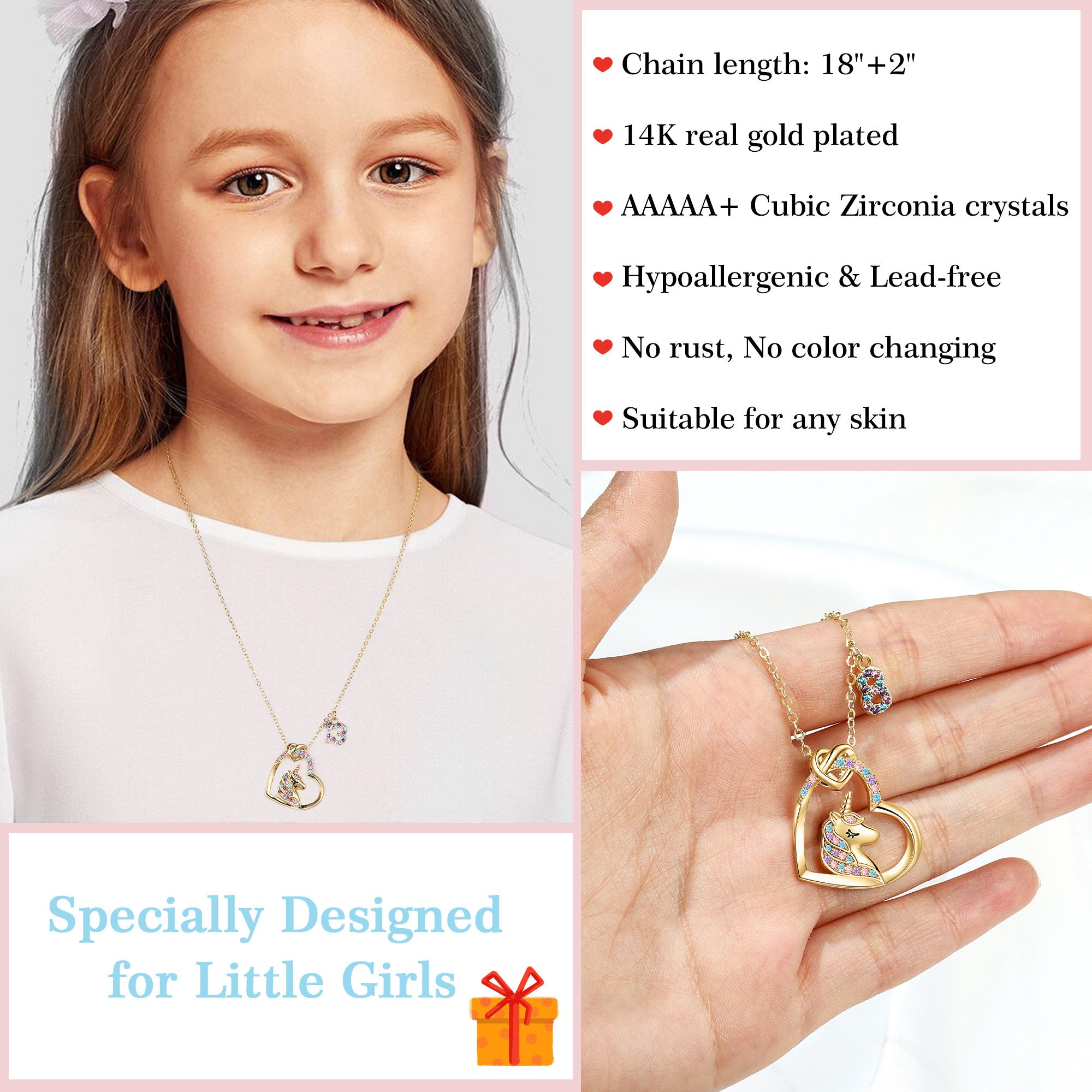 Designed specifically for little girls, this dreamy heart unicorn necklace perfectly blends a mystical unicorn, sparkling zircons, and personalized age numbers to create a precious piece of jewelry that captures every moment of growth. Made from high-grade hypoallergenic copper and plated with a thick layer of 18K gold, this gold unicorn necklace not only safe for delicate children's skin but also imbues the necklace with a dreamy golden sheen, allowing each stage of growth to shine with its own unique brilliance.