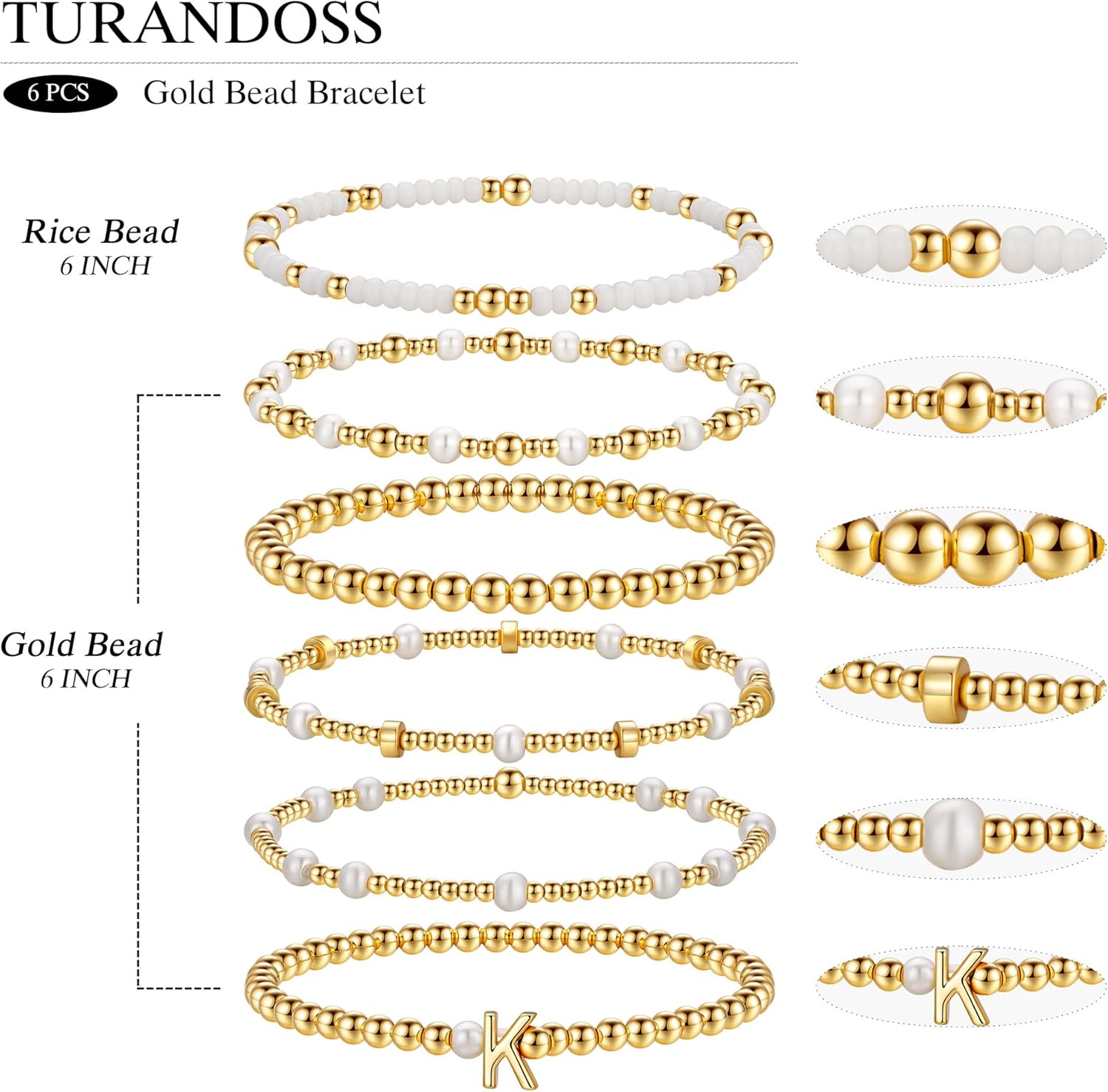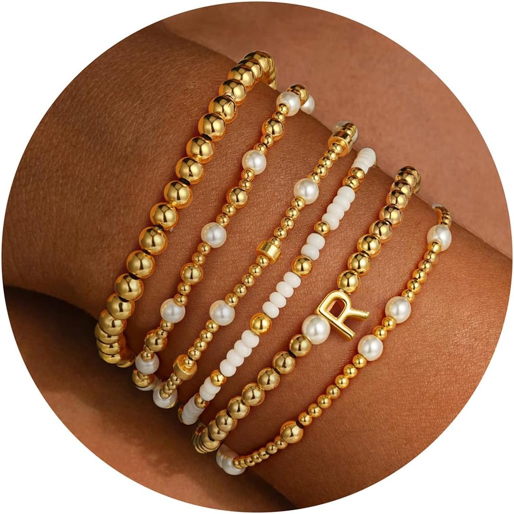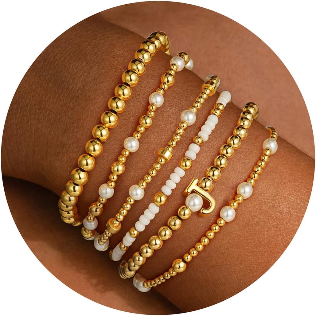 Turandoss 6 Pcs Stacked Beaded Boho Handmade Pearl Initial Bracelet for Women Girls Gifts, Dainty Bracelets for Women, A-Z Letter Bracelet Strand Stretch Jewelry Set Birthday Bridesmaid Wedding Gifts