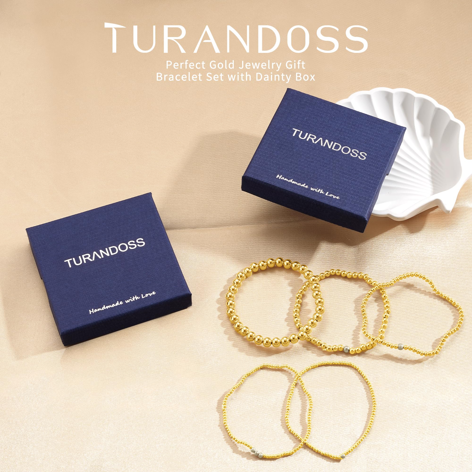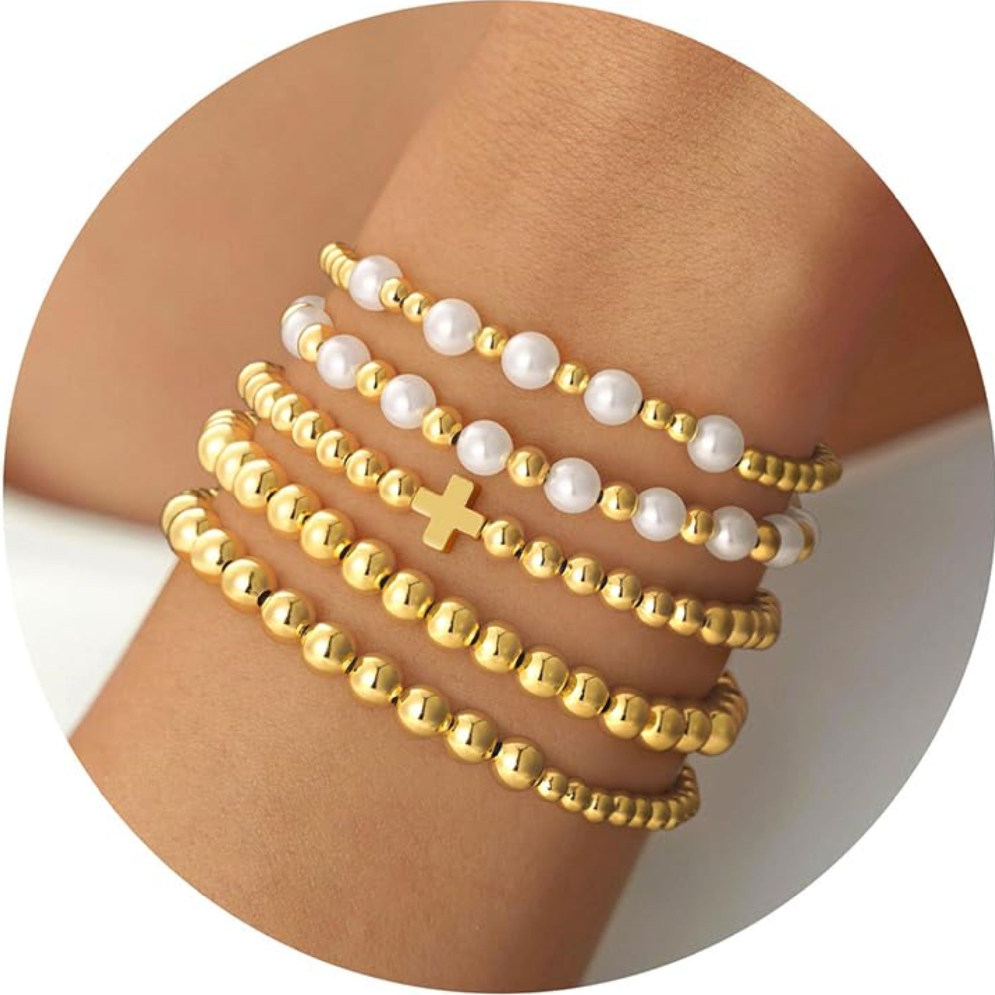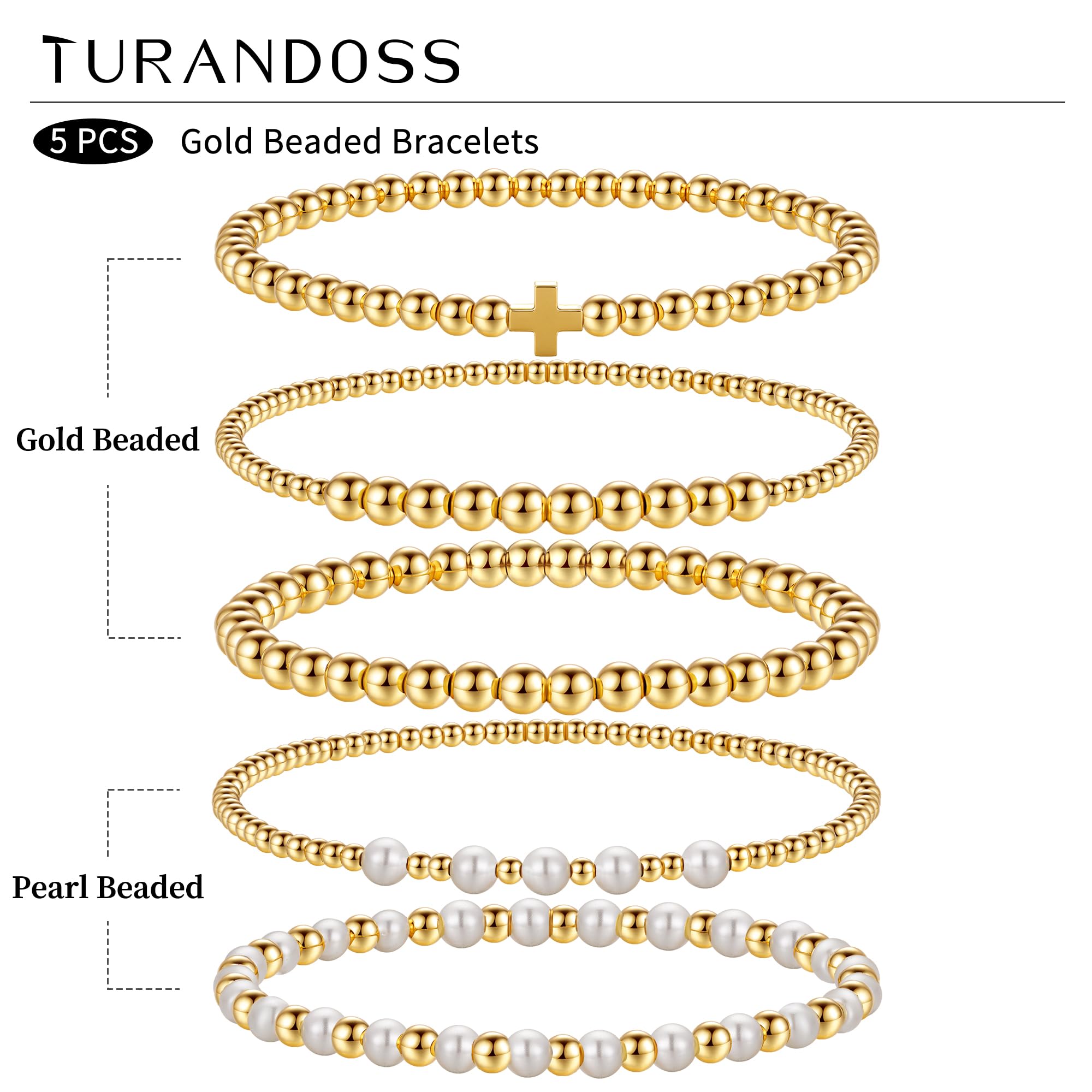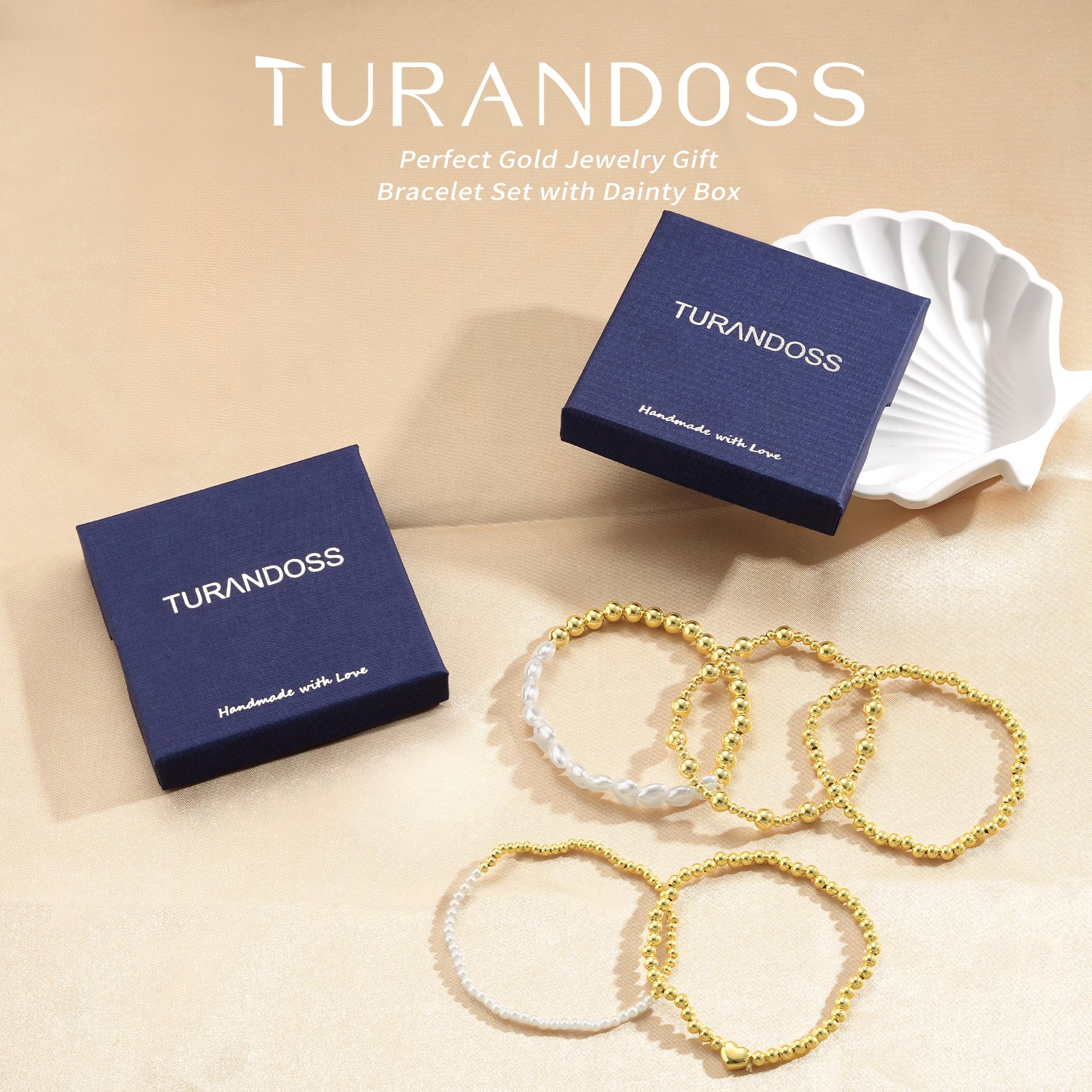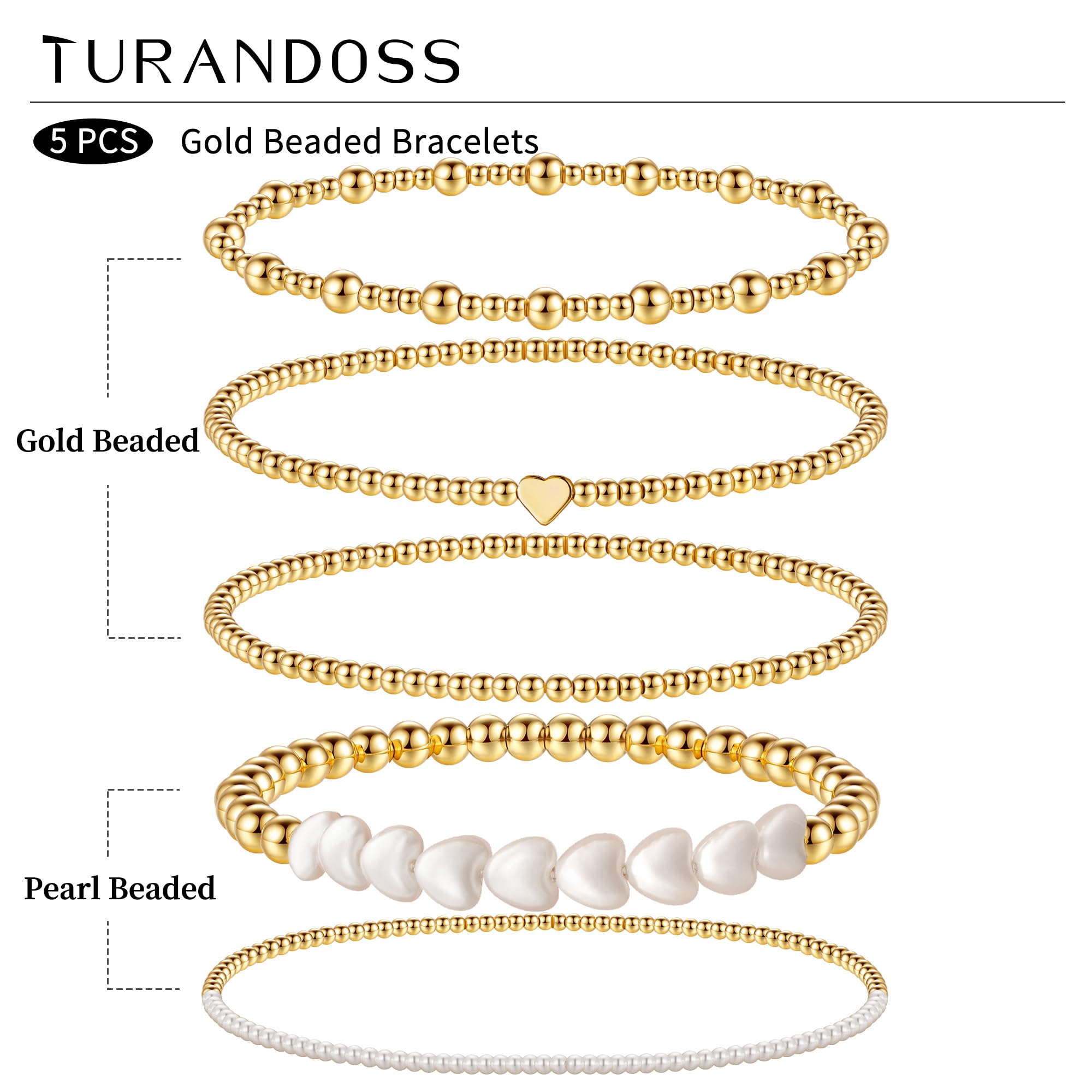Turandoss 14K Gold Plated Bracelets for Women Trendy - 5Pcs Gold Pearl Heart Beaded Bracelet for Women, Layered Stackable Bracelets Gold Jewelry, Birthday Gifts for Her Mom Girlfriend Wife