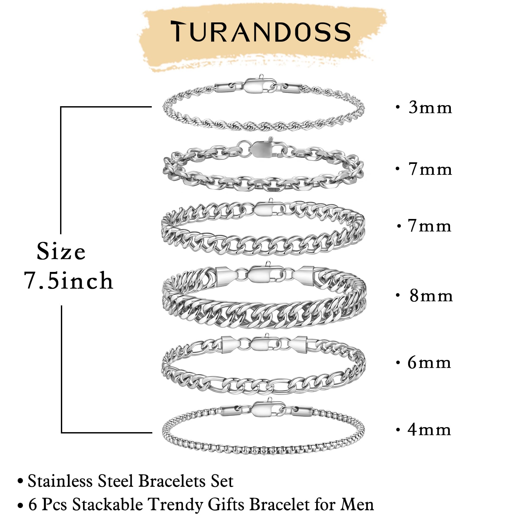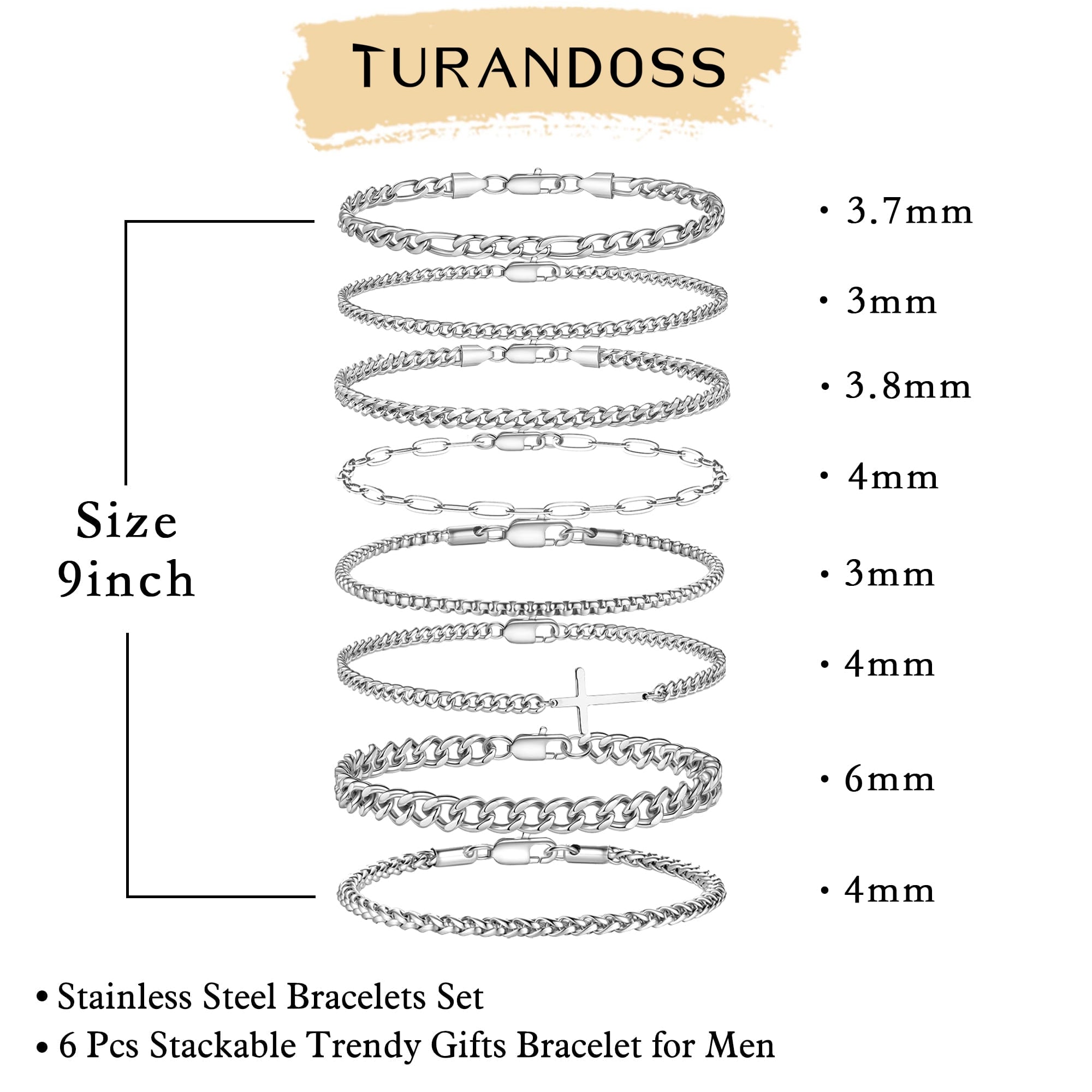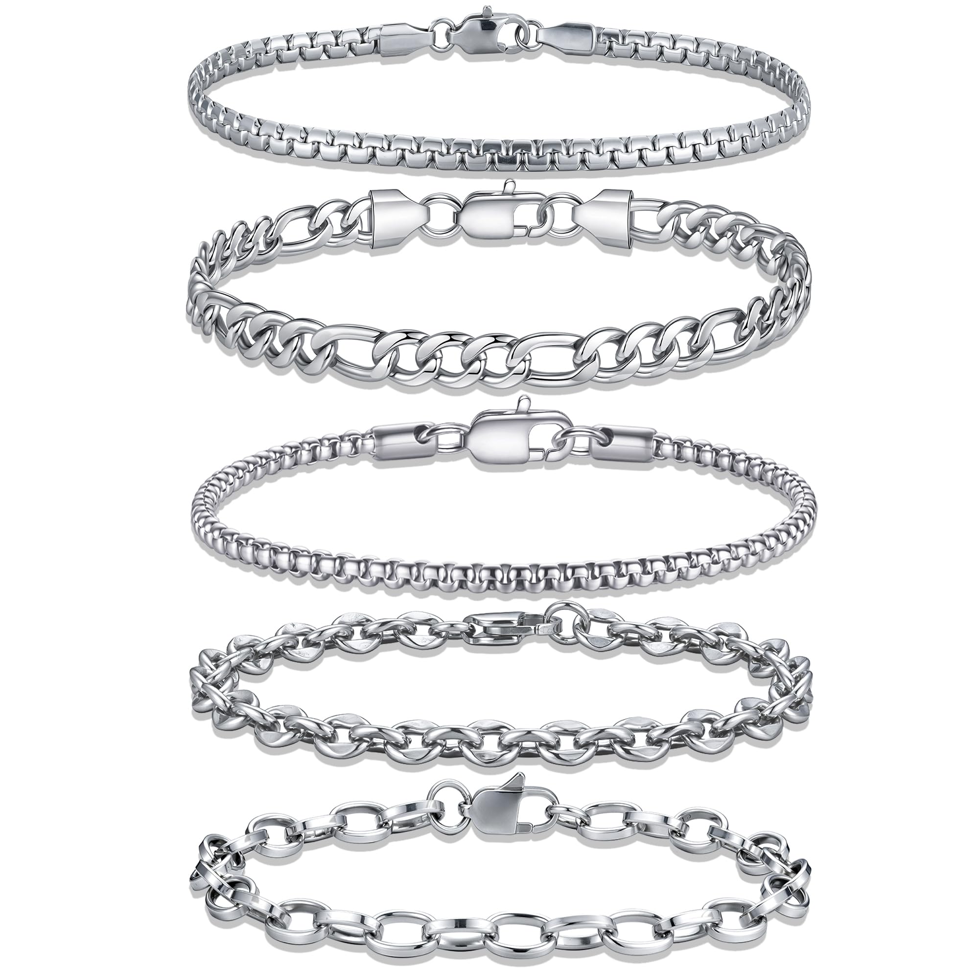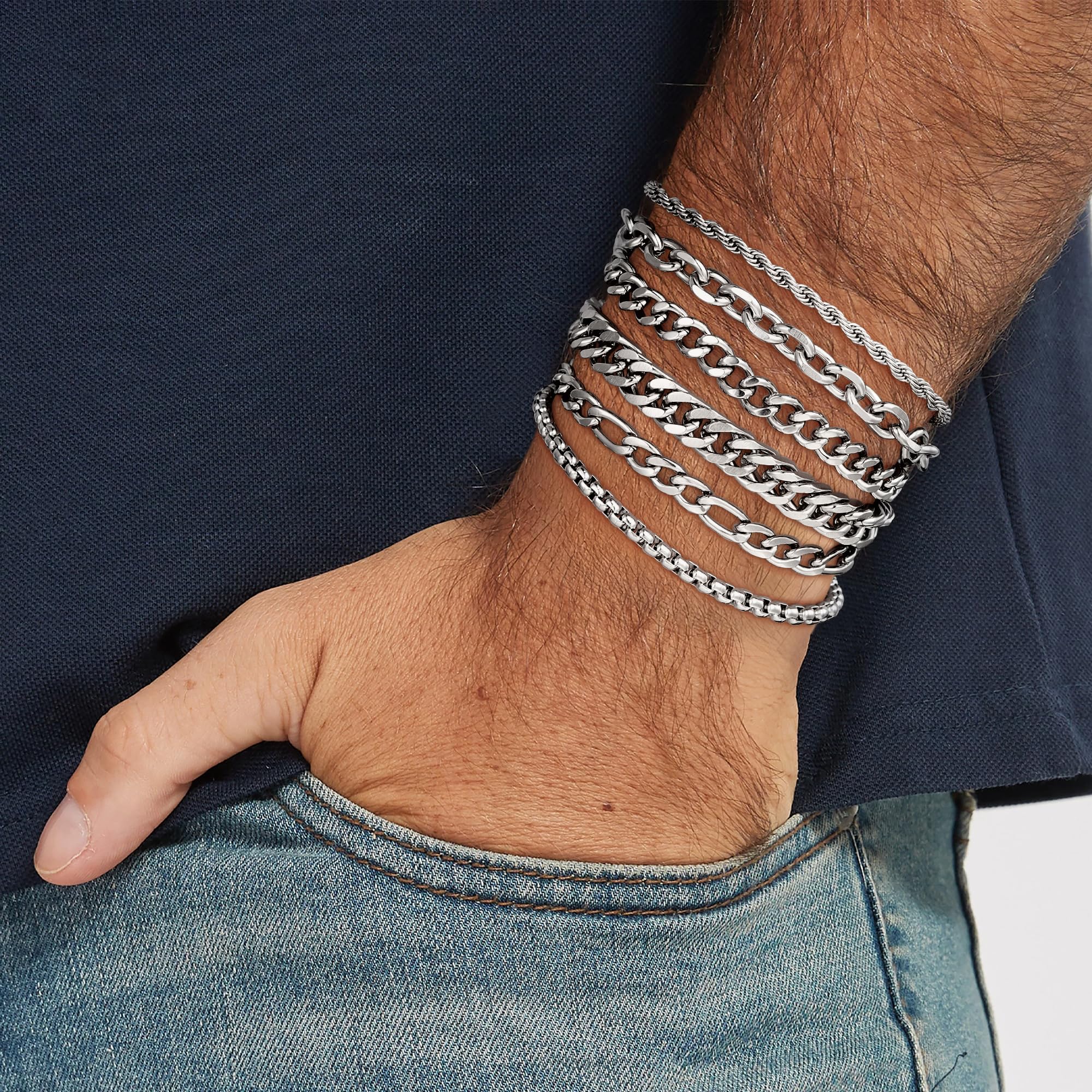 Turandoss Silver Figaro Chain Bracelets for Men - Stainless Steel Figaro Rope Link Bracelet Stack Chain Silver Bracelets Set Trendy Jewelry Gifts for Mens 8.3 Inches