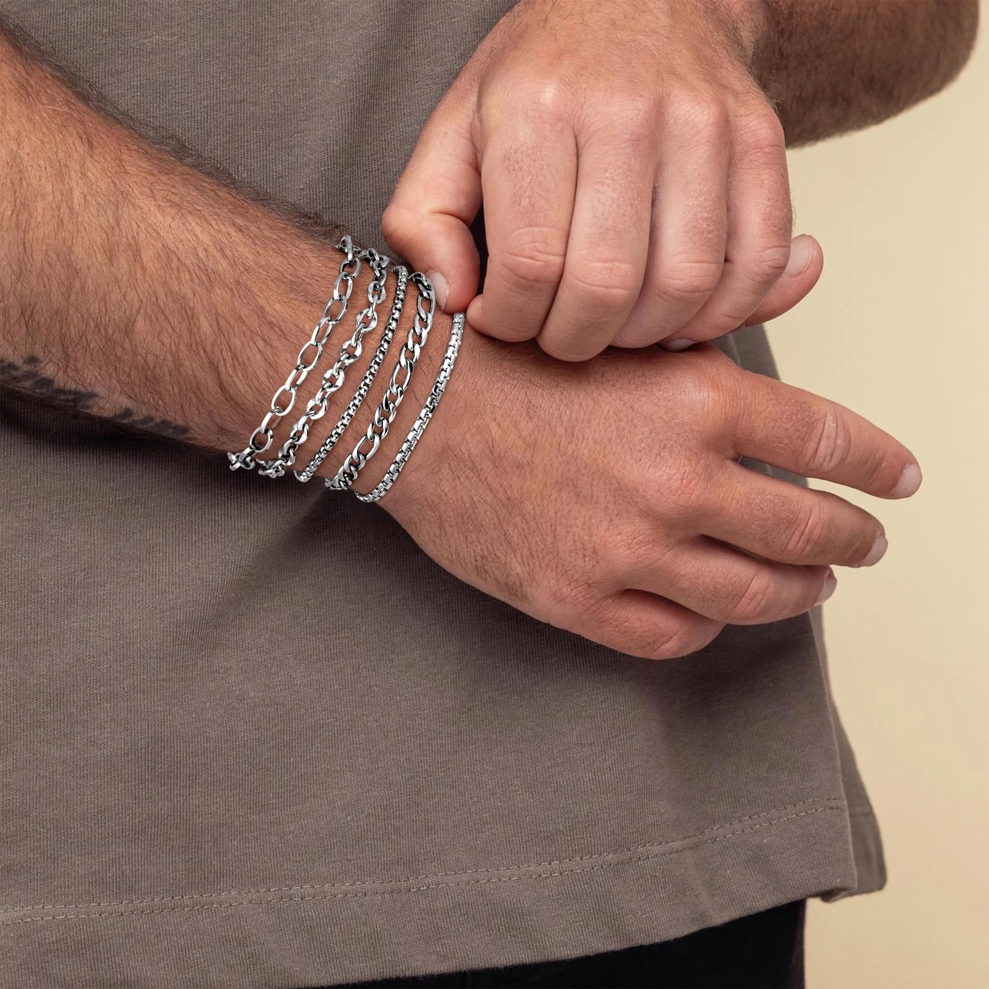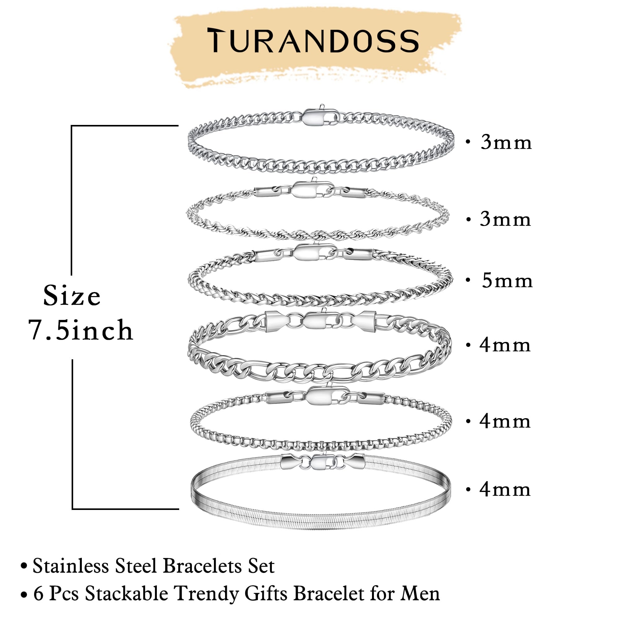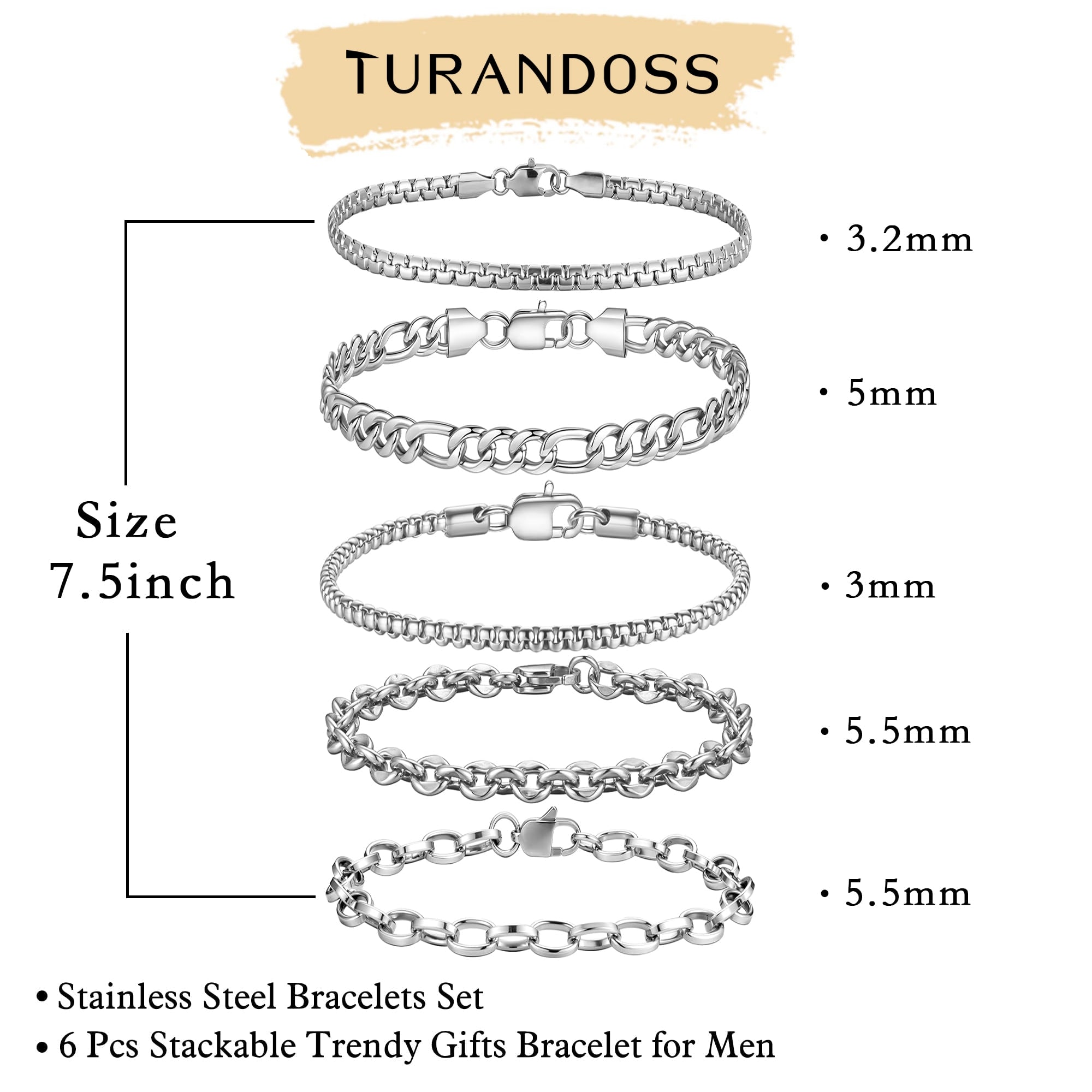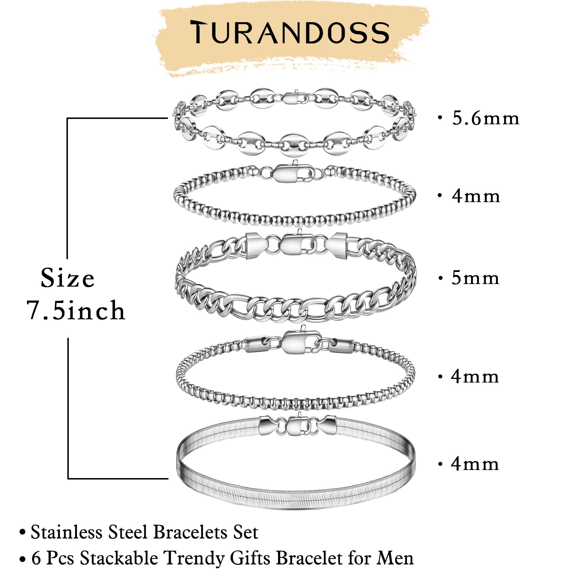 Turandoss Silver Figaro Chain Bracelets for Men - Stainless Steel Figaro Rope Link Bracelet Stack Chain Silver Bracelets Set Trendy Jewelry Gifts for Mens 8.3 Inches