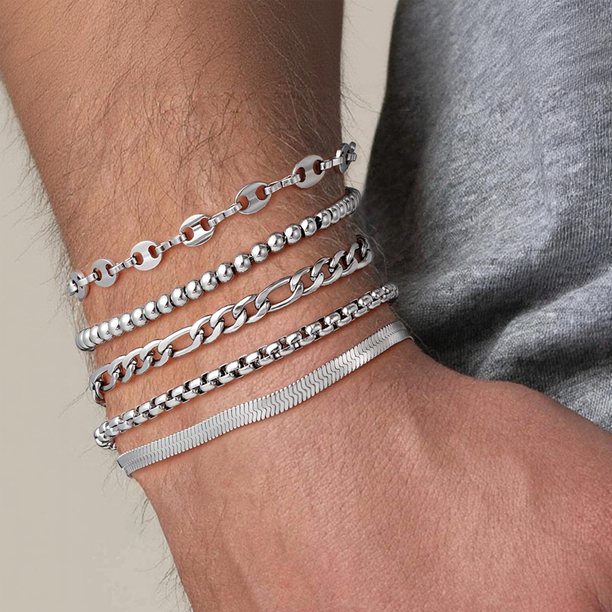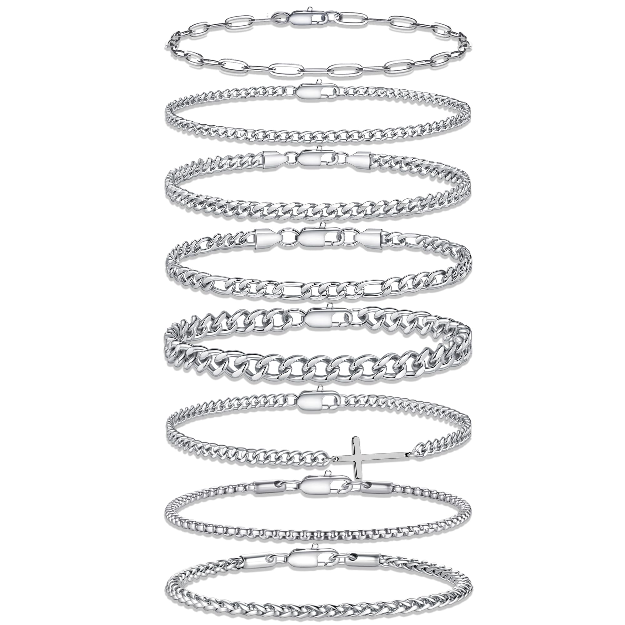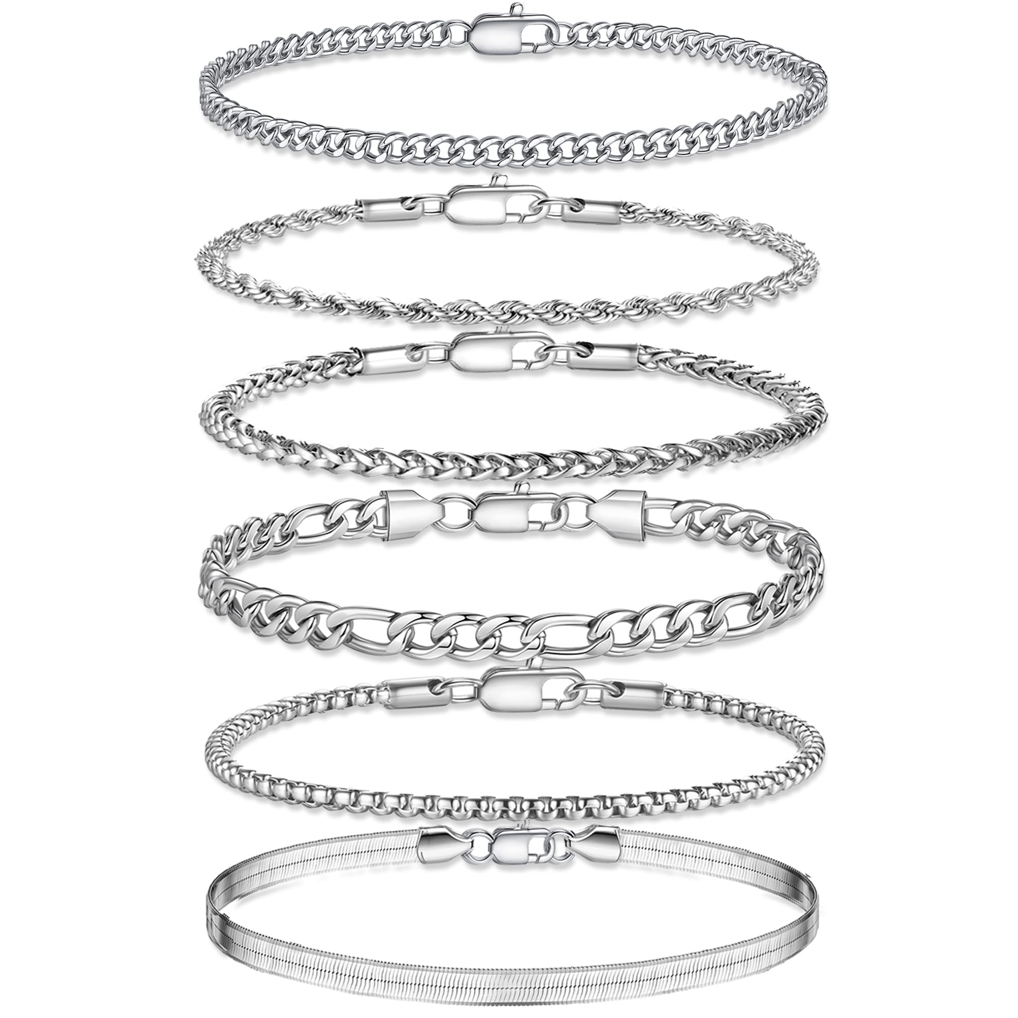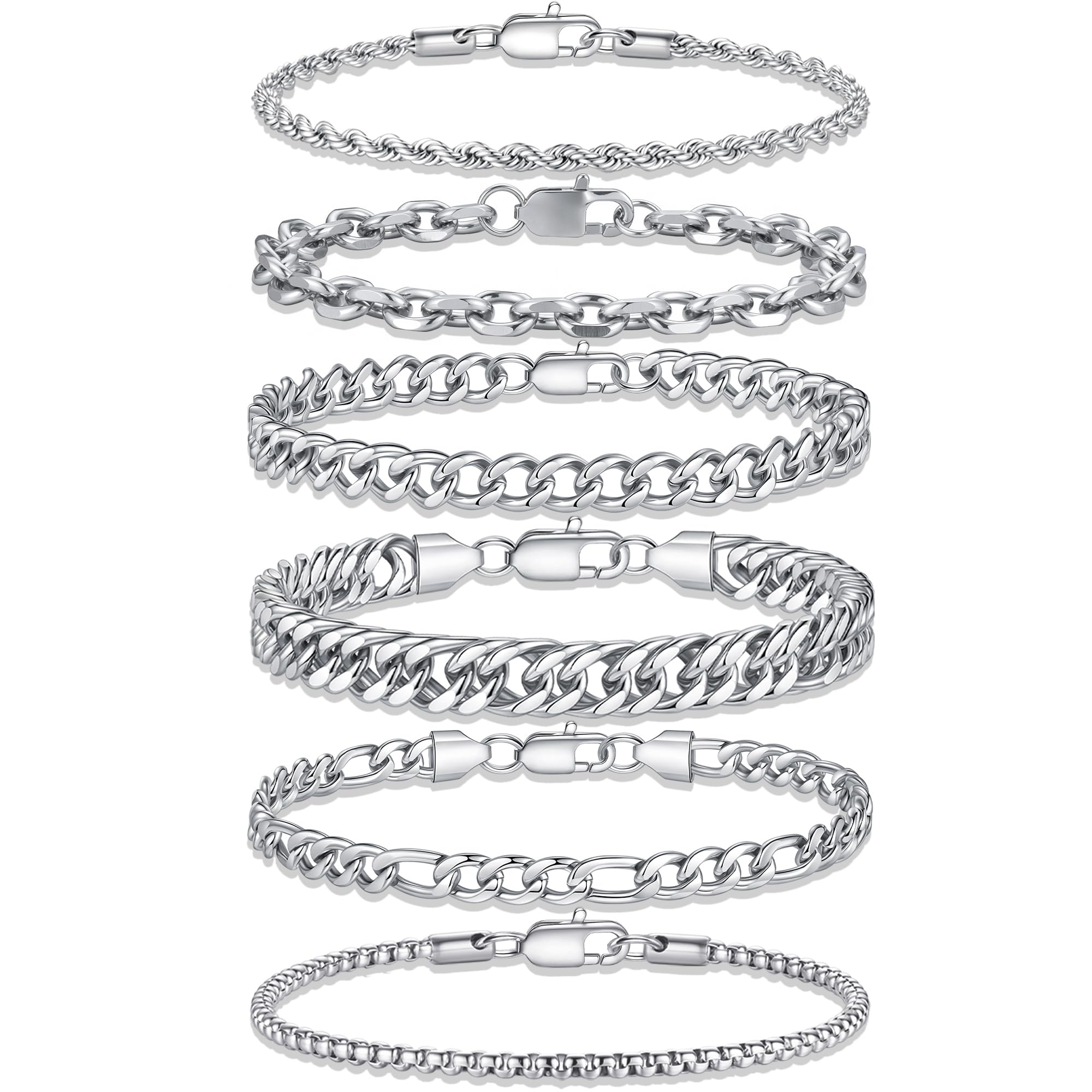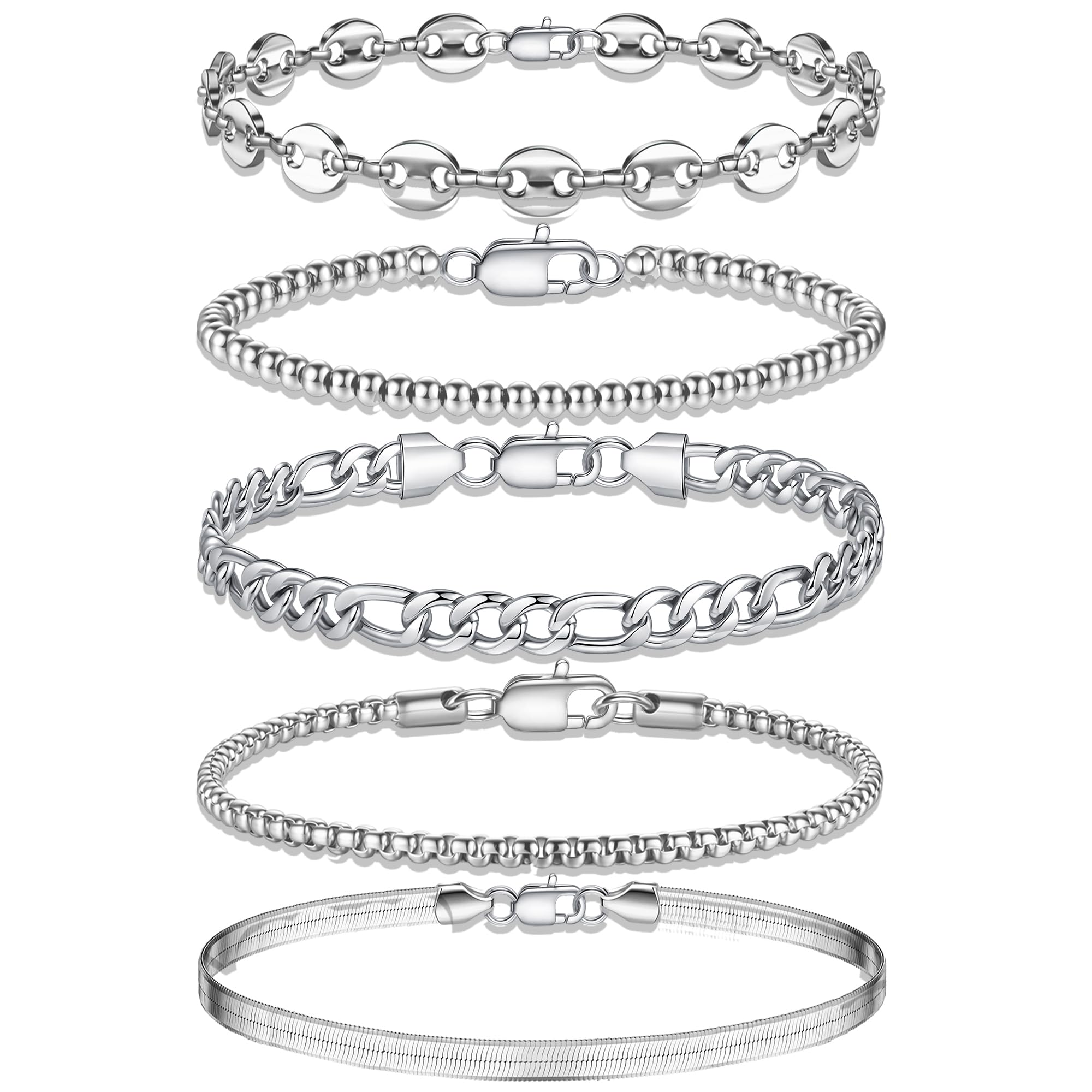 Turandoss Silver Figaro Chain Bracelets for Men - Stainless Steel Figaro Rope Link Bracelet Stack Chain Silver Bracelets Set Trendy Jewelry Gifts for Mens 8.3 Inches