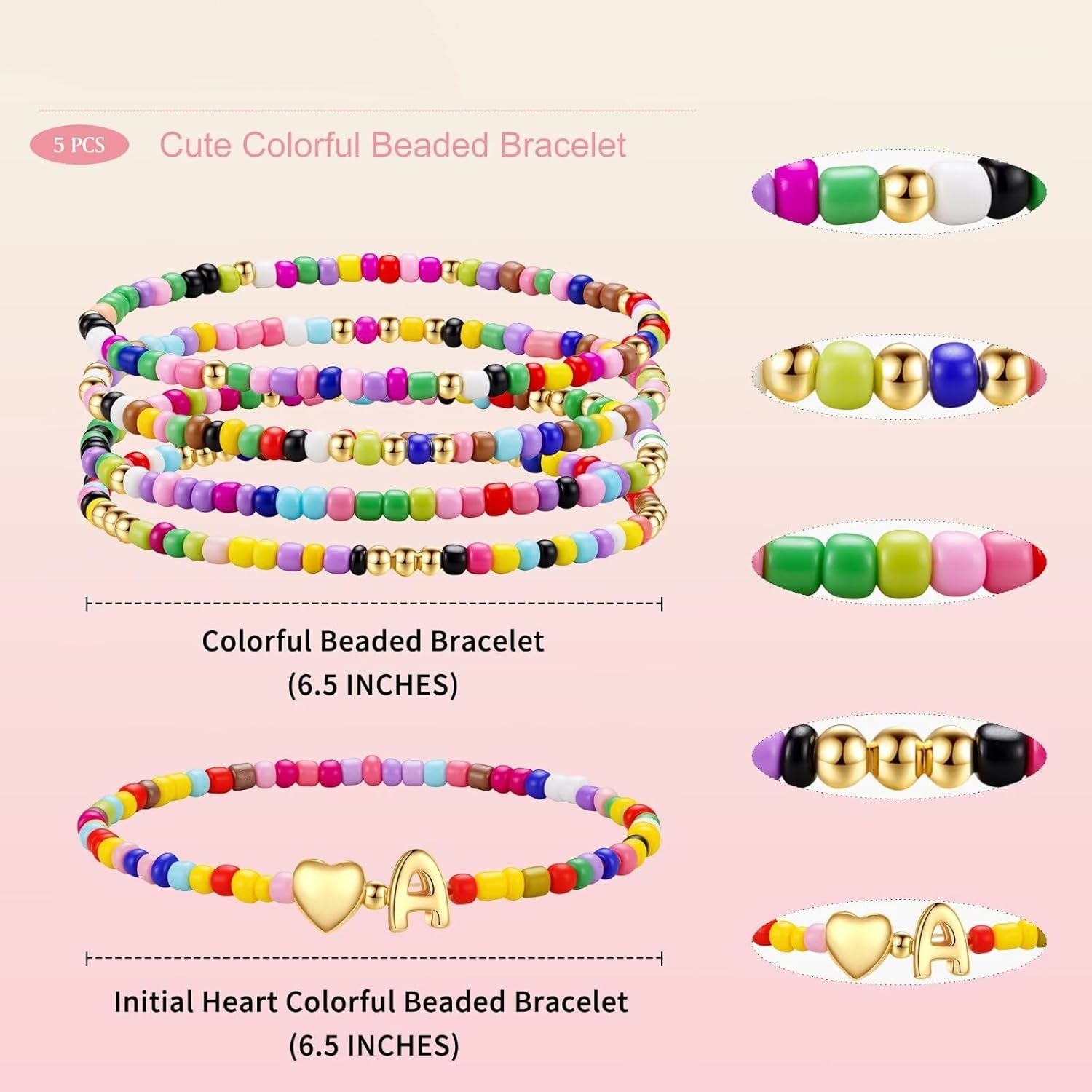 Turandoss 5Pcs Colorful Beaded Bracelets for Girls Women - Cute Bohemian Beaded Bracelets Stretch Stackable Summer Heart Initial T Bracelet Jewelry Birthday Gifts for Daughter Granddaughter Niece